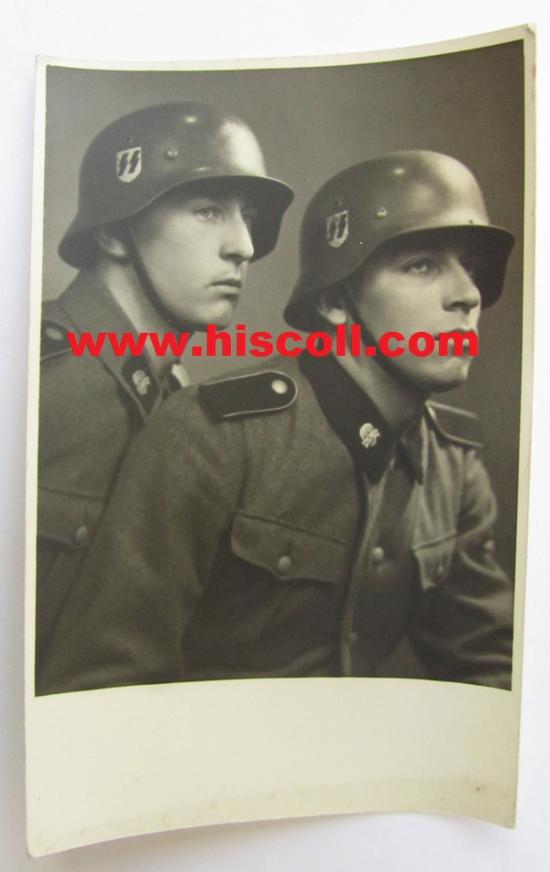 This is a truly very nice (and actually scarcely encountered) period and/or post-card sized, studio portrait-picture, depicting two Waffen-SS soldiers ie. 'SS-Männer', both proudly wearing a steel-helmet and belonging to one of the 'SS-Totenkopfstandarten' (ie. the 'SS-Standarte Nordland), in overall very nice condition. The neat portrait - sized: 13 x 8,5 cms. and printed on 'Kodak' photo-paper - shows various interesting details such as the (rarely encountered!) 'horizontal'-based 'Totenkopf'-collar-tabs, the (almost certainly) white-piped soldiers-type shoulderboards and of course the neat steel-helmets, showing the fully exposed - and clear! - 'runes'-decals. The detail on the picture is truly extraordinary and very sharp. The white space under the photo is void of any text whereas the back shows a photographers-stamp and bears the text: 'Mein lieben Kamerad Seoo blieb im Krankenhaus für immer für Grossdeutschland 1943' and the text: 'Wien 1940 Zur Erinnerung an meinen besten Kameraden Sepp Petzelberger'. It should be noted that all (early!) SS-pictures wherein the SS- steelhelmets are worn are very desirable and can easily be considered scarce. This portrait originates from a private household where it was found together with the other portrait I offer under number 29640. Simply a very nice and surely not often encountered 'SS-Totenkopfstandarte'- ie. SS-Standarte Nordland-related picture-portrait!