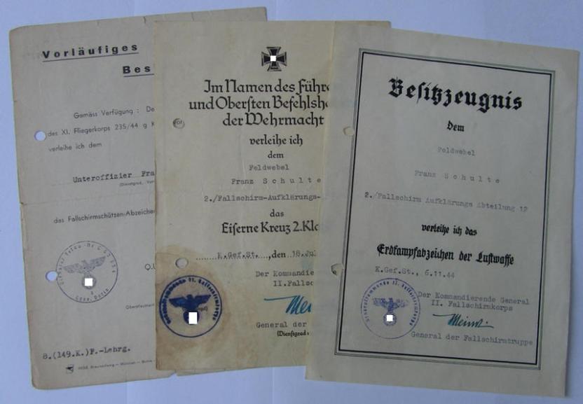 This is a truly very nice - albeit small-sized ie. 3-pieced - WH (LW) Fallschirmjäger- (or paratrooper-) related grouping, comprising of 3 'standard'-type award-documents for respectively an Eisernes Kreuz II. Klasse (= iron cross second class), an Erdkampfabzeichen der Luftwaffe (= LW ground combat-badge) and a very rarely encountered award-document (or Vorläufige Besitzzugnis) for a: Fallschirmschützen-Abzeichen in Stoff (= cloth para-troopers jumpbadge), all three documents as awarded to Feldwebel (or sergeant) Franz Schulte, member within the (famous and desirable!): 2./Fallschirm-Aufklärungs-Abteilung 12, all three documents in overall nice, albeit clearly used ie. folded and/or hole-punched condition. The first document in the set is a neat standard (A5-sized) document for the Eisernes Kreuz II. Klasse (= iron cross second class) was awarded to Schulte on 18 Juli 1944 and is in a nice - ie. folded and/or hole-punched condition: it is however not denazified and in an overall nice condition (it is just a bit yellowed ie. stained caused by normal age). The document was most certainly handed out at the front (which can easily be deducted from the typed wording: K.Gef.St.). It is nicely - and clearly! - signed by Schultes commanding general-officer (at the time of the award), being the famous FJ-ace and General der Fallschirmtruppe named: Eugen Meindl (16 July 1892 - 24 January 1951). Meindl was a famous career airforce-officer, who was awarded almost all grades of the Knights Cross of the Iron Cross. He won respectively the Ritterkreuz (on 14 June 1941 as Generalmajor and commander of the Fallschirmjäger-Sturm-Regiment), the Eichenlaub (on 31 August 1944 as General der Fallschirmtruppe and commanding general of the II. Fallschirmkorps) and the also the Schwerter (on on 8 May 1945 as General der Fallschirmtruppe and commanding general of the II. Fallschirmkorps. The document is also accordingly ink-stamped and bears a (clear) ink-stamp that IMO reads: Generalkommando II. Fallschirmkorps. The second document in the set is an equally nice - and rarely encountered! - standard (A5-sized) document (or Besitzzeugnis) as awarded on 6 November 1944 for a Erdkampfabzeichen der Luftwaffe (= LW ground combat-badge). This piece is also in a nice - ie. folded and/or hole-punched condition: it is however not denazified and in an overall nice condition (it is just a bit yellowed ie. stained caused by normal age). Also this document was most certainly handed out at the front (which can easily be deducted from the typed wording: K.Gef.St.). It is nicely - and clearly! - signed by Schultes commanding general-officer (at the time of the award), being the famous FJ-ace and General der Fallschirmtruppe named: Eugen Meindl (16 July 1892 - 24 January 1951). The document is also accordingly ink-stamped and bears also a (clear) ink-stamp that IMO reads: Generalkommando II. Fallschirmkorps. The third document in the group concerns a rarely encountered (and also A-5 sized) award-document (or Vorläufige Besitzzugnis), as intended for a: Fallschirmschützen-Abzeichen in Stoff (= cloth para-troopers jumpbadge). This document - which was awarded on 18 March 1944 - is also in a nice condition overall: it is not denazified but is also hole-punched and/or folded (into two) and comes as found. It concerns a neat Vorbedrückte Besitzzeugnis that is nicely signed by an (regrettably unidentified) Oberstleutnant und Kommandeur and was issued at the: Fallschirmschule I. This document is also nicely - and readable - ink-stamped (with a stamp that reads: Dienststelle Feldp.nr. L52354 - Lgpa. Paris.) It should be noted that all Fallschirm-Aufklärungs-Abteilung-related award-documents - especially those signed by Meindl! - are very desirable and collectable and do not often appear for sale! All three documents show some wear and/or age as stated above but are still very nice and/or collectable. Simply a very nice, small-sized and/or later-war period: 2./Fallschirm-Aufklärungs-Abteilung 12-related award-document grouping: only the first such neat grouping I ever had on offer!