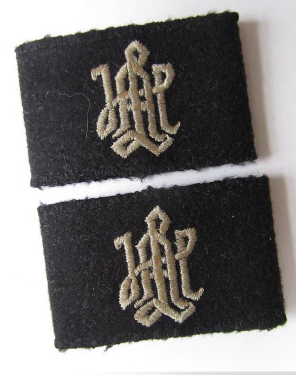 This is a truly very nice - and fully matching! - pair of IMO mid-war period-, Waffen-SS, enlisted-mens'-(ie. NCO-) type shoulderstrap-slip-ons (or: 'Übershube'), as intended for an: 'SS-Schütze der Leibstandarte Adolf Hitler' (or LSSAH), in overall very nice albeit moderately used and/or worn condition. The neat black-coloured, woolen-based slip-ons - which measure approximately 5 x 3,1 cms. as more often and which are neatly machine-embroidered in silver-grey (linnen-based) thread - show off-factory 'stitched'-borders: something that was more often seen and simply done in order to overcome obvious fraying or alike. The set shows the typical machine-embroidered: 'LAH' cyphers. The set shows minimal age and/or wear and shows some minimal staining. It should be noted that these slip-ons are very desirable and can easily be regarded 'very rare'. Simply a great - and 100% original! - SS soldiers'-type LSSAH 'Übershube'-set in a very nice albeit minimal worn and/or issued condition: just the first such very collectable pair I ever had on offer!