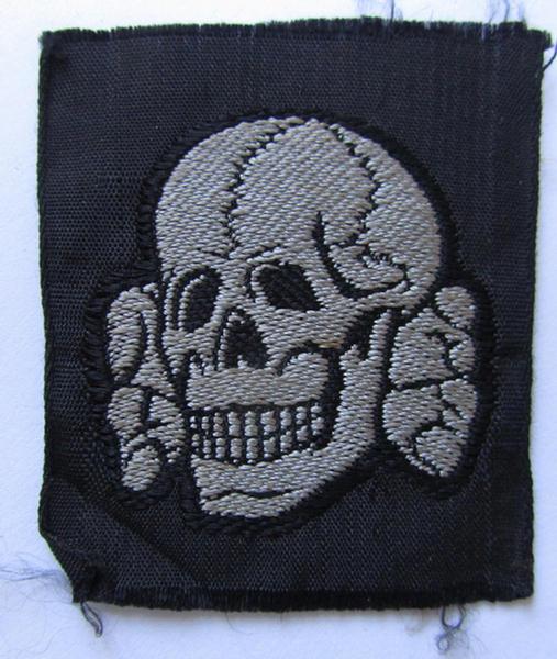 This is a truly very nice - and nowadays rarely encountered! - example of a Waffen-SS 'BeVo'-style cap-skull, being of the desirable 'larger-sized'-type, in an overall very nice (ie. unconfectioned and stonemint-/unissued!) condition. The skull is neatly executed in so-called 'BeVo'-weave pattern (in bluish-grey-silver coloured linnen on a black-coloured - also linnen-based - background) and can of course easily be mounted on a 'Waffen-SS' side-cap ('Schiffchen') or even M43 cap if wanted. Of additional interest is the fact that the skull is of the desirable 'larger-sized'-type. The skull was never folded nor confectioned and can simply not be upgraded. Simply a very nice and desirable Waffen-SS item that is not inexpensive but nowadays fully worth its money. These original cap-skulls are almost impossible to find and are nowadays hardly ever offered for sale!