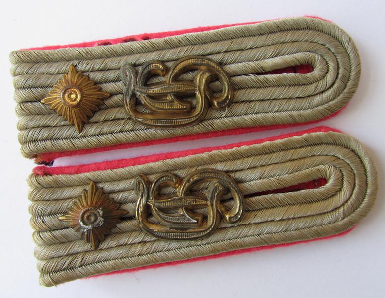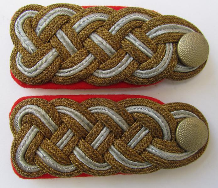This is a truly very nice - and fully matching and actually rarely encountered! - pair of WH (Heer), IMO quite early-war-type, general-officers'-type shoulderboards, as intended for a: 'Generalmajor des Heeres', in overall very nice, and IMO only moderately used ie. worn condition. The boards - which are truly 'text-book' in all facets and measure approximately 9,8 cms. in length - come on their functional (typical small-sized ie. modelled-) tongues. The pair - which had very smooth woolen (truly moleskin-like!) bright-red (almost orange!) coloured backs - never had any golden-coloured pips attached (as is as such for a general-officer with the rank of: 'Generalmajor'. The pair comes with its (originally attached) golden-toned ie. 'pebbled-style' screw-on buttons (ie. 'Schraubknöpfe') and shows some truly minimal moth-damage (see pictures). The buttons are still neatly golden-coloured: they are just a bit tarnished ie. frosted as normally encountered. The set has fairly sub-dued 'upperdecks' (which are constructed from the fairly early-type 'heavy-weight' bullion and was most certainly a pair that was worn on a 'front-used' tunic. It should be noted that all (genuine!) general-officer shoulderboards are very hard to encounter and can easily be graded rare. The set - as well as the general-officers' breast-eagle which I offer under number 30224 - originates from the USA were it was brought as a so-called: 'veteran bring-back': regrettably is the name of the general who wore this set not anymore known. Simply a truly attractive set of shoulderboards as worn by a: 'Generalmajor des Heeres': only the first such very attractive set I have on offer!