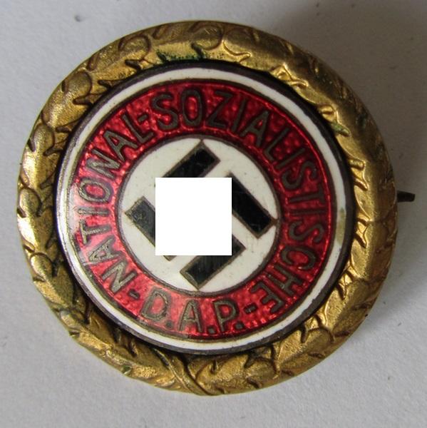 This is a truly stunning, example of a: 'Goldenes Ehrenzeichen der N.S.D.A.P.' (or golden honorary N.S.D.A.P. membership-pin/party badge), being of the smaller variant (or: 'kleines Abzeichen für den Zivilanzug'), as intended for the civil attire, which is uniquely numbered on the back with the bearers number: '50931', in overall very nice, albeit issued and/or moderately worn, condition. The badge - which has an approximate diameter of 24 mm. as always - has a nice age patina and has IMO never been cleaned nor polished. The neat little badge is showing some normal wear but has truly no enamel damage whatsoever (it is just a tiny bit dirty ie. tarnished as more often encountered) and shows a fully preserved golden-toned finish on the back (just the front-side rim shows some minimal wear). This example - which has a bright-red coloured enamelled area - comes on its regular 'pin/catch' set-up (which is naturally still fully functional and present). Simply a very nice and original, smaller-sized 'Goldenes Ehrenzeichen der N.S.D.A.P.': only the second such neat and rare example I ever had on offer!