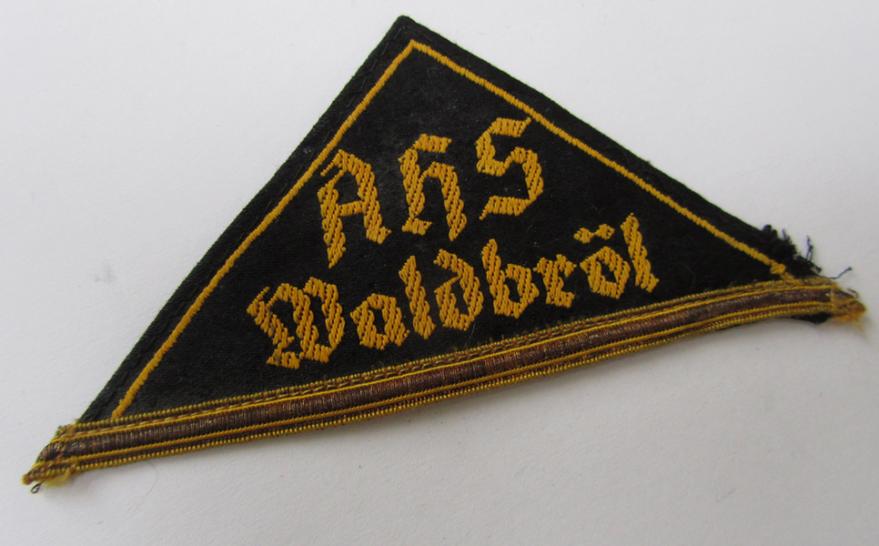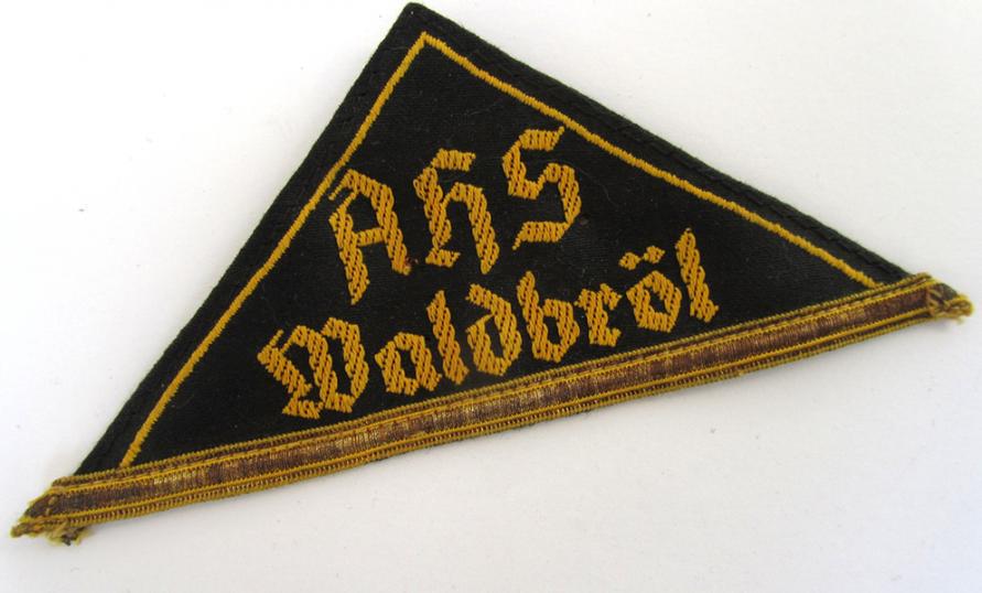 This is a truly nice example of the extremely rarely encountered, male-type, 'Hitlerjugend' (HJ) district- triangle entitled: 'AHS Waldbröl' (= 'Adolf Hitler Schule'), still having its attached 'RzM etiket' and showing an additionally attached, golden-toned 'rank-stripe' (signifying membership before 1933), in overall very nice (IMO virtually mint- ie. unissued!) condition. This is a 'male' specimen, indicating that it is neatly woven in yellow-coloured linnen on a black (also linnen-based-) background. This one still retains its original, paper 'RzM-etiket' attached ('A-Stück'). It should be noted that the 'AHS' HJ triangles (being merely intended for the students within one of the 10 - ie. 12 - 'Adolf Hitler Schulen') rank amongst the most difficult and/or rare youth-triangles to encounter: the ones having an attached, golden 'rank-stripe', signifying membership before 1933 even more so. This specimen - bearing the abbreviation: 'AHS Waldbröl' - was intended for students that belonged to the area ('Gebiet') 'Köln-Aachen' and who followed their studies at the: 'Ordensburg Sonthofen'. The patch was IMO never tunic-attached and is in a very nice condition overall: it simply shows no defaults whatsoever. Simply a great opportunity to obtain one of these very rarely encountered youth-insignia: only the second such rare 'AHS' district-triangle I ever had on offer!