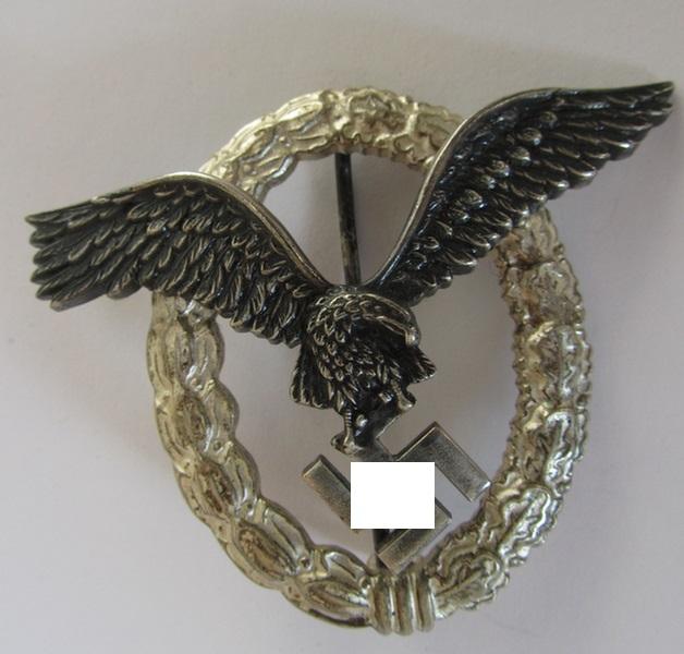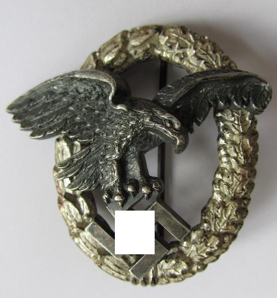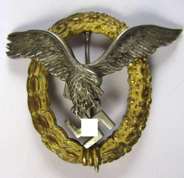 This is a truly very attractive and/or pronounced 'Buntmetall'- (ie. 'Tombak'-) based example of an unmarked WH (Luftwaffe) so-called: 'Gemeinsames Flugzeugführer- u. Beobachterabzeichen' (aka: 'Doppelabzeichen' or combined pilots- ie. observers-badge) as produced by the desirable maker: 'F.L.L.' (= 'Friedrich Linden'), in overall very nice albeit moderately used ie. worn- and/or period-repaired, condition. The neat - and most certainly rarely encountered! - piece has simply extraordinary detail and retains most of its silver-toned ie. golden-toned finish. The piece is as stated a neat non-maker-marked example that was with certainty produced by the: 'Friedrich Linden'- (ie. F.L.L.-) company based in the town of Lüdenscheid. The badge is as stated IMO only moderately worn but truly shows great character and/or fine, pronounced detail. The badge is naturally in great shape ie. order: the pin and/or both rivets are in fine (and/or undamaged nor repaired-) order. The catch is however period-repaired (ie. possibly replaced) but is still fully functional. The piece shows the neatly 'cut-out' feathers on the eagle. All these details can be seen as typical hallmarks for a fine period by the 'F.L.L.'-company produced award. The badge has IMO never been cleaned or polished and has a neat and/or slightly tarnished 'age-patina'. The award originated from a private household in Germany and once belonged to a (regrettably) unidentified pilot and/or trainer. Simply a very nice example of this very attractive Luftwaffe award that is IMO priced according to its period-repaired condition: a fully undamaged example would easily fetch the double of my asking-price!