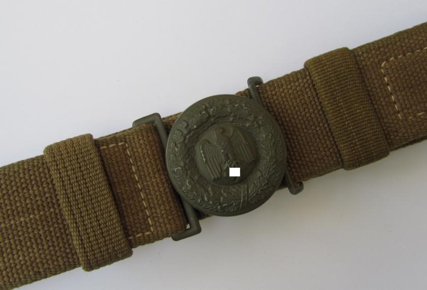 This is a truly stunning, WH (Heer) 'tropical' (ie. DAK- or 'Deutsches Afrika Korps'-) related- officers'-type belt- and buckle set (aka: 'Tropenfeldbinde für Offiziere'), comprising of neat (alumium-based and/or field-grey-/greenish- coloured buckle which comes mounted on a - 98 cms.-long sized - belt that is neatly maker-marked (by a company named: 'G.Reinhardt' based in Berlin) and which is clearly dated: '1941', in overall very nice (ie. virtually mint!) condition. The neat - and very detailed! - buckle, which is as stated an unmarked specimen (as always) retains almost all of its original (fairly 'matted') greenish- ie. field-grey finish and still has superb detail (there is no real damage nor wear visible: just some mininal traces of having been minimal handled ie. moderately used over the years). The buckle was IMO never cleaned and shows some minimal dirt and aging: it has as stated lost some of its green-painted finish over the years (IMO simply caused by handling as stated above). These belt-buckles saw only limited usage within the DAK (or Deutsches Afrika Korps) but saw also usage in the later-war years (Balkan- and/or Mediterranean) combat areas. The - truly mustard-green-coloured - belt - which is neatly maker-marked and/or dated as can be seen on the photos measures approximately 98 cms. in length (something that is also ink-stamped on the leather-based tongue). Moreover are both webbing-based 'lashes' also present and in place (something that is most certainly not always the case!). The belt itself is as mentioned in an equally nice ie. minimally worn and/or used condition: it only shows some minimal staining. The metal catch is also equally green-/ie. field-grey coloured (and totally matches as such the buckle). The set was most certainly worn as such and came as such from a private household: it was never before in a collection. Simply a very nice (and fully matching!) tropical officers belt-/buckle set that is IMO priced according to its superb condition: hard to find a better and moderately used matching set for a better price!