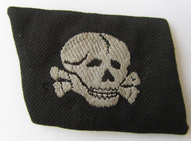 This is a truly stunning example of an 'SS' (ie. 'Waffen-SS') so-called: 'BeVo'-woven, enlisted-mens' pattern, so-called: 'Totenkopf' collar-tab, still retaining its original, paper-based: 'RzM'-etiket ('B-Stück'), as intended for usage by the various Waffen-SS soldiers ie. members within the 'Totenkopfstandarten' ie. 'Totenkopf-Division' throughout the war, in overall very nice (ie. IMO stonemint-/unissued!) condition. The neat and desirable piece was IMO never used nor tunic-attached and shows as stated above - a fully undamaged! - paper-based 'RzM'-etiket ('B-Stück') attached. The collar-tab is very nicely executed in the neat 'BeVo'-weave style' and is a text-book example of this neat technique. The piece shows some minimal age ie. staining IMO simply caused by decades of storage and/or handling. It should be noted that these genuine, 'BeVo'-woven, enlisted-mens'-pattern 'Totenkopf' collar-tabs are actually much rarer than their 'flatwire'-woven officer-counterparts. Simply a very nice and 100% guaranteed original 'BeVo'-woven Waffen-SS 'Totenkopf'-tab: only the first such neat (and very rare!) example I ever had on offer!