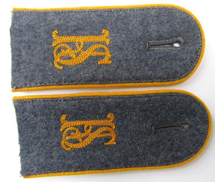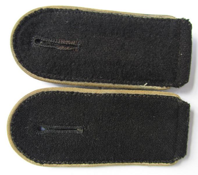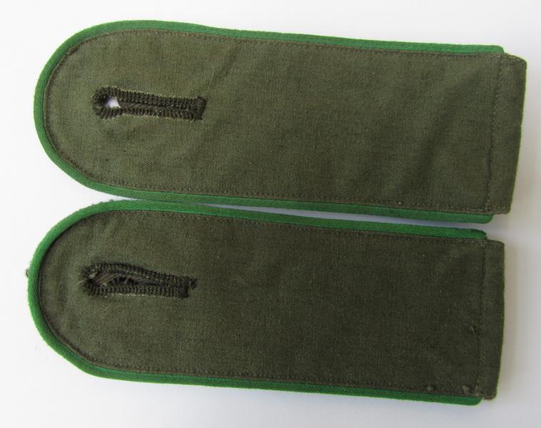This is a truly very nice - and truly very rarely encountered and/or fully matching! - pair of WH (Heeres) shoulderstraps, piped in the desirable darker-green- (ie. 'Grüner'-) branchcolour, as intended for - and or worn by! - a 'Soldat der Gebirgsjäger' (or mountain-troops soldier) being a pair of the model as specifically intended for the protective 'Geb.Jäg.' 3/4-type rain-coat (ie.: 'Gebirgsjäger-Windjacke'), in overall very nice ie. only minimally used ie. worn, condition. The shoulderboards - which have the neat, darker-green-coloured and/or 'silk-like'-type piping - are (IMO) only mimimally used and show only minimal wear ie. age. They have the (standard-type) field-grey coloured and/or woolen-based backings (which show some minimal age ie. slight moth-damage as more often encountered). The boards - which are regular-sized and measure 12,5 cms. - were most certainly intended for wear on the specific 'Gebirgsjäger' protective '3/4-model' protective jacket i.e. rain-coat. This is only the third time I have ever encountered such a neat and most certainly desirable pair: simply a superb pair of shoulderboards of great rarity!