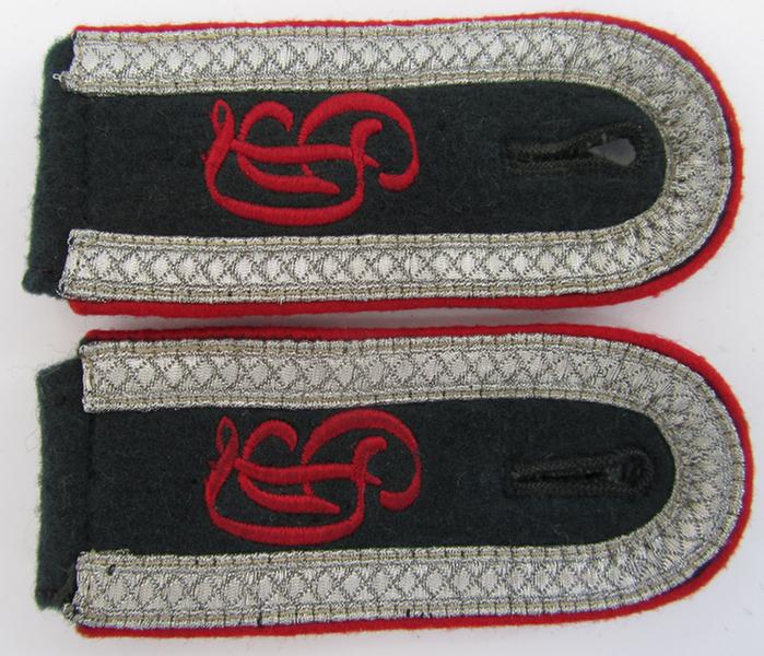 This is a truly very nice - and rarely encountered and/or fully matching! - pair of dark-green coloured, bright-red-piped and/or 'cyphered'-type shoulderboards (of the rounded model), as intended for an: 'Unteroffizier' (ie. junior NCO), who served within an 'Artillerie' unit within the famous 'GrossDeutschland' regiment, in overall very nice and IMO only moderately used ie. worn condition. The neat shoulderboards - which measure each approximately 10,5 cms. in length - have the bright-red coloured and/or woolen-type piping and/or dark-green-coloured 'upperdecks'. The boards show the (machine-embroidered) 'GD'-cyphers and have the 'standard-type', silver-coloured NCO-braid attached, denoting that they were intended (ie. used by) a soldier with the rank of 'Unteroffizier'. The boards are as stated abvove only moderately used and/or worn (some obvious staining and/or usage is present and/or visible) but come naturally on their functional tongues. The set originates from a private household and was never before in a collection. Simply a very nice and truly scarce- and desirable shoulderboard-pair that originated from an artillery-soldier that served with the famous WH 'elite' 'Gross- Deutschland' regiment: only the first such neat 'GrossDeutschland' pair I ever had on offer!