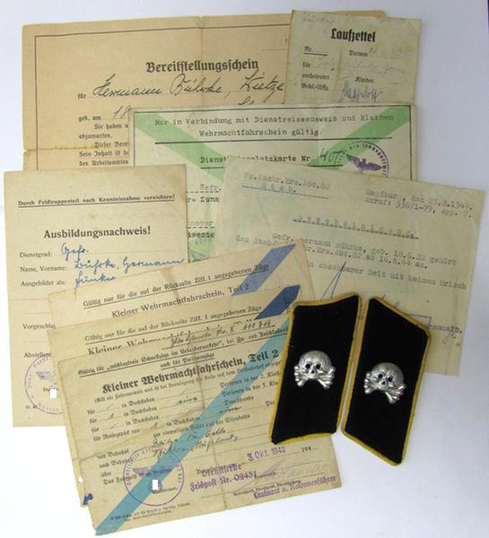 This is a nowadays very rarely encountered - and fully matching! - pair of WH (Heer) black coloured and/or woolen-based, bright yellow- (ie. 'Zitronengelber'-) piped so-called: 'Panzer-Nachrichten' (ie. Panzer-signals-) collar-tabs (as used - amongst others - on the black coloured 'wrap-around' 'Panzer'-model tunics) having metal-based (ie. aluminium-based) 'Totenköpfe' (ie. skulls) period-attached which set comes with a small paper-grouping of the bearer, all pieces in overall very nice, and IMO never worn ie. tunic-attached condition. The set - which originated from a soldier named: 'Hermann Bührke', who served within the unit: 'Stab/Pz.Nachr.Ers.Abt.82' - shows the brownish-yellow coloured and/or 'buckram'-based 'backing' as to be expected. Both - truly very detailed! - skulls (each retaining both their original, copper-based prongs) are IMO originally attached to the tabs: both skulls are matching and identical in execution (they are moreover completely centered something that is not always the case). The set - which has the desirable, bright yellow-coloured 'silk-like'-type piping as to be expected - is as stated in a very nice (ie. virtually mint!) condition (I personally do not think they were once tunic-attached and were just 'kept as a souvenir') and would be excellent fitted to restore any 'Panzer'-tunic ie. wrapper. The pair originates from a private household where they were recently found together with the various papers (amongst which various: 'Kleiner Wehrmachtscheine' (or train-tickets), a neat 'Bereistellungsschein', an 'Ausbildungs- nachweis', a neat 'Bescheinigung' and a small 'Laufzettel'. All papers are nicely - and clearly! - ink-stamped and are all made-out (in 1943/1944) to: Hermann Bührke, who served (as stated above) within the unit: 'Stab/Pz.Nachr.Ers.Abt.82'. Simply a very nice and desirable collar-tab set that is nowadays almost impossible to encounter: only the first such very rare collar-tab/paper grouping I ever had on offer!