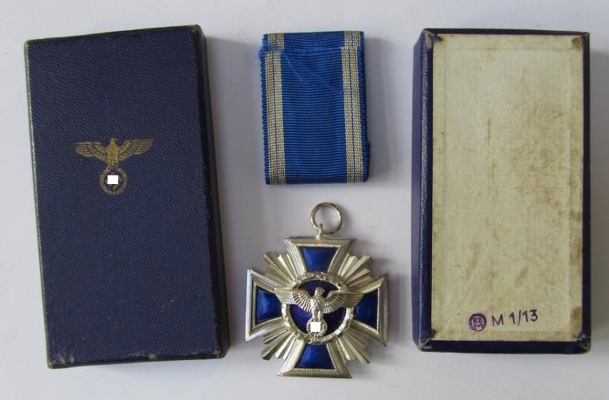 This is a truly superb - and IMO virtually mint! - example of a: 'N.S.D.A.P. Dienst- auszeichnung in Silber' (ie. '2. Stufe für 15 Jahre treue Dienst') that comes in its (rare!) original, carton-based (and/or: 'RzM M1/13'-marked) box ie. etui as issued, in overall very nice (IMO virtually mint!) condition. The neat - and very detailed! - medal comes together with its period, non-confectioned and/or folded (ie. 23 cms. sized-) ribbon long, as issued. The medal has IMO most certainly never been cleaned and retains all its bright-coloured silver- toned finish: it truly has great pronounced detail and retains a fully undamaged and preserved enamel finish. The award simply shows no wear nor age and has never been mounted on its ribbon but is minimally tarnished (ie. dirty), caused by years of storage only. The piece came in its (dark-blue coloured carton box (ie. etui) - which is actually rarely encountered in itself! - and that shows a neat (and undamaged) golden-toned eagle-device on the top and is moreover blue-coloured ink-stamped on the back/bottom with the makers-signification: 'RzM M1/13'. The box shows a yellowish-coloured (felt-like-) inner-lining and just shows some storage wear only. Simply one of the nicest such examples of this desirable and/or complete 'N.S.D.A.P.-Dienstauszeichnung'-set I ever had on offer!