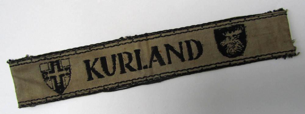 This is a very nice - and truly scarcely encountered! - example of a full-length WH cuff-title-/ ie. armband entitled: 'Kurland', in overall very nice albeit clearly used ie. tunic-removed condition. The armband on offer here is a full-length (approx. 23 ie. 24 cms. long) example which shows both (unfinished) ends plied backwards in order to overcome fraying during usage and wear. The armband is in a very nice albeit clearly used condition and shows no flaws nor damage whatsoever (it shows some normal staining and wear of having been worn on a tunic once: the stitching-holes and minimal thread-remains are still visible). The cuff-title is executed in black-coloured linnen on a bluish-/grey (also linnen based) background. It should be stated that this is not a commemorative WH cuff-title (such as for example the 'Afrikakorps' cuff-title) but an official award that needed official recognition and entry in both Soldbuch and Wehrpass. The armband was handed-out in order to commemorate the fierce battles that took place in the 'Kurland' area in late 1944/1945. Simply a very nice and original (& full-length!) example for which I naturally give a life-time garuantee on its originality. A very nice piece that is IMO priced according to its rarity!