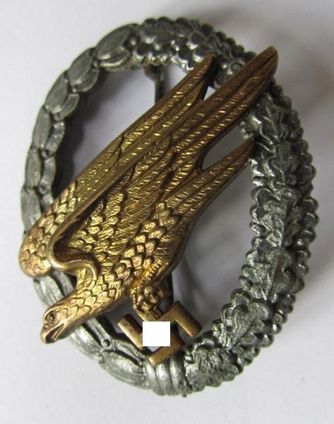 This is a truly very nice example of a 'Feinzink'- (ie. zinc-based-) version of a detailed WH Luftwaffe 'Fallschirmschützenabzeichen' (or paratroopers' jumpbadge) as was procuced by the desirable maker: 'B & N' (= 'Berg u.Nolte'), in overall nice, albeit clearly worn ie. used (and/or possibly period-repaired?) condition. The piece has simply extraordinary detail and retains most of its golden-toned (and/or bluish- coloured-) finish. The piece is nicely maker-marked on the back with the makers-signification ie. logo: 'B & N - L' (which signifies that it is a typical zinc-piece as produced by the: 'Berg und Nolte' company based in the town of Lüdenscheid). The badge is clearly worn but truly shows great character and exceptionally fine detail. The badge is naturally in great shape ie. order: the pin-attachment and/or both rivets are in fine (and undamaged nor repaired) order (both are also typical hallmarks for a fine period by 'B & N' produced badge). The badge has IMO never been cleaned or polished and has a neat and/or slightly tarnished 'age-patina' (it was never cleaned nor polished though!). It should however be noted that the badge has IMO a period-repaired catch-set-up (which can be seen at the pictures: this is so neatly done that it is hardly disturbing nor noticable). The badge was - as such - recently found at a German private house-hold: it was never before in a collection. These genuine paratrooper-badges are getting though to find and it has been a long time since I had a nice one on offer on the web-site. Simply a very nice example of this very attractive award: of course did I price it according to its possibly period-repaired catch-set-up!