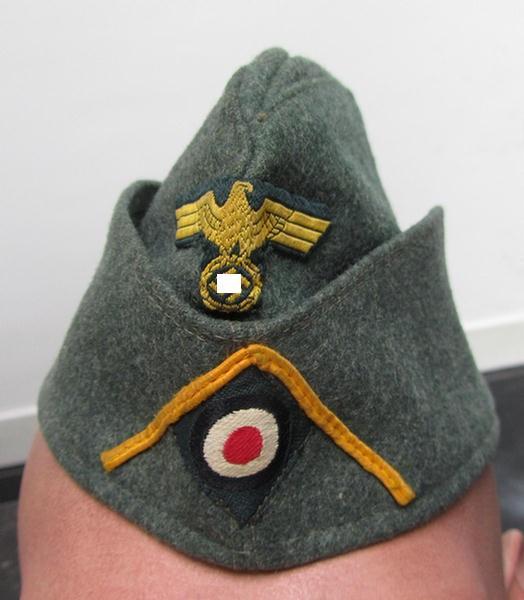 This is a truly superb example of a WH (Heer) so-called: M34-model side-cap (or 'Schiffchen'), having a period-stripe of grass-green- (ie. 'Wiesengrüner'-) coloured 'Soutache' attached (and as such intended for a soldier or NCO of a: 'Panzer-Grenadiere'- ie. rifle- regiment) and which is nicely and clearly maker-marked with the makers-mark: 'A.Valet - Mützenfabrik - Stuttgartt - Bad Cannstatt') and that is clearly dated: '1941' and size-stamped, in a very nice (virtually mint-/unissued) condition. The cap - executed in 'regular', field-grey coloured 'Heeres' woolen-cloth has no damages nor mothing whatsoever and is nicely and cleraly maker-marked and dated: '1941' as stated above. The cap is fairly sized and measures 58 cms. (which is a size that would easily fit a mannequin) and shows a field-grey coloured eagle and cocarde, both executed in 'BeVo'-weave pattern (IMO period attached by hand). The cap shows a neat greyish 'matted' and/or linnen-based lining (which is standard for these caps). The cap shows only minimal staining and or usage-marks (IMO just caused by years of storage and/or minimal wear). Simply a very nice and original example of a - scarcely encountered! - 'Panzer-Grenadiere'-related side-cap that is IMO almost impossible to upgrade!