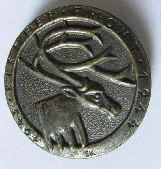 This is a truly very nice - and decorative! - example of a tin-based lapel-pin (or so-called: 'Traditions-/Erinnerungsabzeichen') depicting an elk, surrounded with the text: 'Eismeerfront 1943-1944' (IMO belonging to one of the 'Infanterie' ie. 'Gebirgsjäger' divisions within the 'Deutsche Wehrmacht' that most certainly served in Northern Europe), in an overall very nice and only minimal used and/or worn condition. (I have certainly seen the badge before but could not find a reference yet stating which specific division ie. regiment used this particular badge). The neatly constructed circular pin has an approximate diameter of 3,5 cms. - depicts an elk-symbol, surrounded with the text: 'Eismeerfront 1943-1944' - and is constructed from silvered (tin-based) metal: it is a bit dirty but retains a truly nice age patina (some scratching and wear is however visible, IMO simply caused by having been worn). The - maker-marked - piece shows a makers'-abbreviation that reads: 'S.K.' and comes on its four functional metal-based prongs. It shows some regular wear and tarnish (but was most certainly never cleaned nor polished). These 'semi-official' pins were worn on both uniform, cap and/or civil attire. A nice - and most certainly rarely encountered! -'Traditions-/Erinnerungsabzeichen': I deem that I have priced this nice little item accordingly!