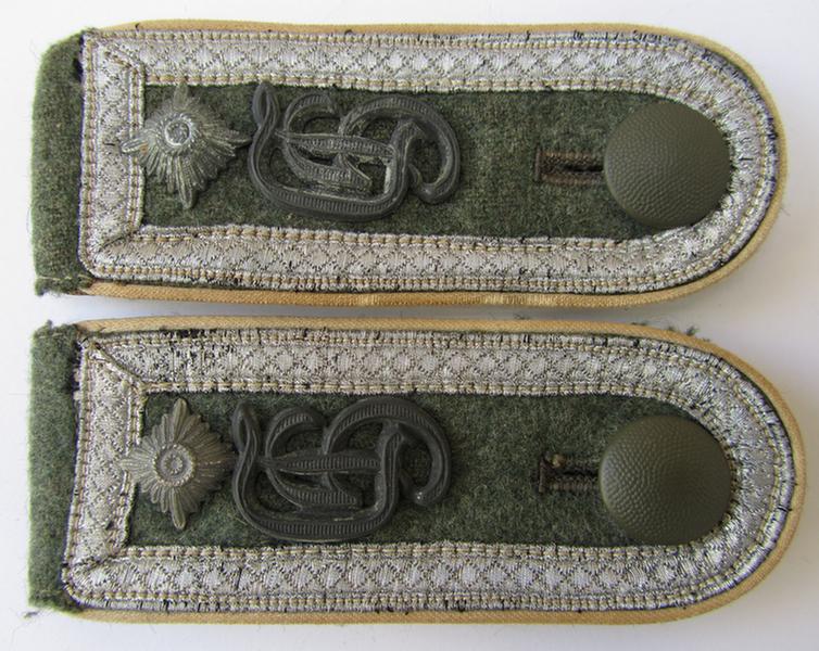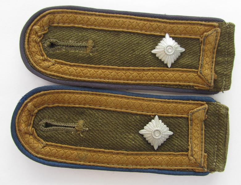 This is a truly very nice - and fully matching! - pair of (IMO fairly early-war period ie. 'DAK'- or: 'Deutsches Afrika Korps'- related-) WH (Heeres) NCO-type, 'tropical'-style shoulderstraps, piped in the darker-blue (ie. 'Blauer')- coloured branchcolour, as intended for - and most certainly worn by a: 'Feldwebel der Sanitäter' (or medical sergeant), in overall very nice, albeit moderately used ie. worn, condition. The boards - which each measure approximately 12 cms. in length - both have the typical brownish-green- (ie. tropical-) coloured and/or linnen-based, 'upperdecks' (and field-grey coloured woolen 'backings' as to be expected) and have the neat and desirable darker-blue (ie. 'Blauer')- coloured 'silk-like'-type piping. The set comes on its functional tongues and comes as most certainly worn and/or stored for decades. The set has the neat 'tropical'-type, mustard-yellow coloured- (ie. sub-dued-) type NCO-braid attached. Moreover does the set show two (identical and/or aluminium-based-) pips attached, denoting the a.m. rank of: 'Feldwebel' (or sergeant). The pair - which is as stated fully matching and was always together and worn as such - is a tiny bit dirty ie. stained and shows the clear evidence of having been moderately used and/or worn. Simply a very nice - and very desirable! - fully 'text-book' NCO-type, tropical shoulderboard-pair that belonged to a: 'Feldwebel der Sanitäter'. Of additional interest is the fact that this set is: 'mitbefördert': the soldier who wore them started as an 'Unteroffizier' and was promoted to 'Feldwebel' (as can be noticed by the later added and/or horizontally mounted NCO-braid). It should be noted that all (genuine!) tropical- ie. 'DAK'-related- shoulderstraps are very hard to encounter and can easily be graded 'very rare': this is only the sixth such tropical pair I have ever encountered: the only reason why I sell these is that I have already a similar pair in my private shoulderboard collection. I am aware of the fact that they are highly priced something that is IMO according to their unmistaken rarity and/or desirability!