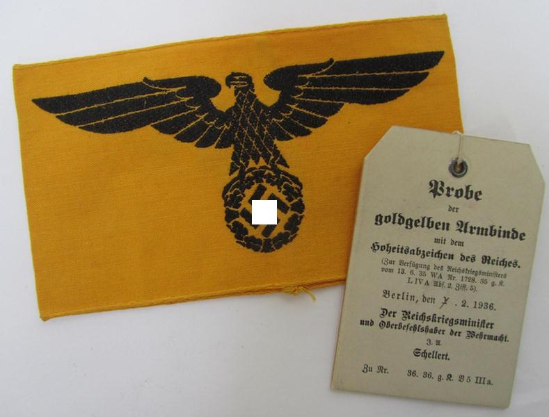 This is a truly unique - and with this armband never before encountered! - official period sample-card (or 'Probe') which is dated '1936' and having an example of a yellow-coloured armband or 'Armbinde' as intended for employees working in the State's service attached, in very nice ie. untouched condition. The (thick) carton card provides a detailed description of the armband (which reads in German language: 'Probe der goldgelben Armbinde mit dem Hoheitsabzeichen des Reiches') and was officially issued by the: 'Reichskriegsminister und Oberbefehlshaber der Wehrmacht' on 7 February 1936. These cards (or 'Proben') were official 'example-cards' (ie. 'Musterkarten') and were as such intended to serve as examples for producers of official insignia. These cards always had an official (red-coloured) lacquer seal on the back with which the insignia was firmly attached (which is naturally also the case with this piece). Over the years I personally encountered several examples of these 'Proben' (with various insignia from cap-cocardes to shoulderboards) but it should be noted that these 'Proben' can be easily graded as 'very rare'. As stated above has the example on offer here a nice example of a yellow-coloured, linnen-based armband (executed in the thicker cloth) attached as intended for officials- and designated employees working in the state's service. The armband - which has a total length of 35 cms. - is of course in mint-/unissued condition and shows the interwoven black-coloured eagle on a yellow background, and is executed in a technique similar to the neat 'BeVo-weave' production technique. The detail on the - left facing! - eagle is really stunning. Simply a very nice - and maybe 'one-off'! - occasion to acquire a genuine official period sample-card (or 'Probe')!