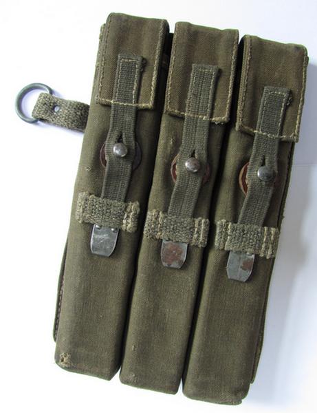 This is a truly stunning - and very rarely encountered albeit regrettably single! - WH (Heer ie. Waffen-SS) reed-green coloured and/or IMO , having the desirable 'webbing'-based closing-straps with metal end-parts, in overall very nice, albeit moderately used ie. worn, condition. The pouch - which originates from my private collection - still shows the (remains of a) white coloured stamp that reads: 'MP 38 u. 40' as can be seen on the back (see pictures). The pouch is in a nice albeit clearly used ie. worn condition overall: some minimal staining is present and/or visible. The pouch is void of a maker-marking: I deem that this has simply been worn-away during obvious usage and/or wear. The fairly course-structered cloth shows some obvious wear and/or age but the neat (and desirable!) 'webbing'-based closing-straps with metal end-parts are void of any damage and of course fully functional. Non of the webbing has been re-stitched nor replaced. All metal parts (rings and snaps are a bit dusty and/or dirty as usual but nothing shocking nor disturbing). It should be noted that any original MP pouches are getting harder to find something that is even more valid for these 'tropical-style' examples. The pouch on offer here would look simply superb if remounted on a mannequin or stored in a (tropical and/or later-war period) WH equipment set-up. Simly a very nice and desirable example that I have IMO priced according to its obvious rarity!