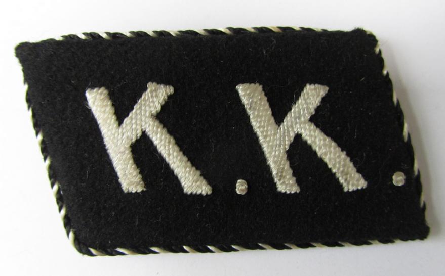 This is a truly extremely rare - and/or possibly unique! - Dutch-made, woolen-based and/or silver-/black-piped (and black-coloured) collar-tab bearing the abbreviation: 'K.K.' (or: 'Kontroll Kommando'), being a specific KZ-guard-unit related to the 'Nordwest' guard-battalion, in overall very nice and/or IMO virtually mint condition. This specific 'Kontroll Kommando' (or control unit) was a very small-sized unit that was a part of the 'Nordwest' guard-battalion and that was founded in June 1941. The KK-unit had a dual-task: supervising (KZ!) prisoners and/or Dutch workers compulsory drafted for labour in Germany. The K.K.-staff-members wore field-grey coloured uniforms having a pair of rectangular collar-patches attached (of which the tab on offer in a neat and rare example!). The K.K. probably never amounted to more than about two- or three hundered men (the highest rank was equivalent only to police-inspector. Its members were frequently 'lost' to either the Waffen-SS or 'Nordwest' guard-battalion something that resulted in dissolving of the 'Kontroll Kommando' in October 1944: the few remaining members were incorporated into the Dutch State Police. There is truly little known about this obscure Dutch WWII organisation and/or its specific insignia (which are often only illustrated by means of a drawing). The tab on offer here is of unquestionable raririty and originality: it came with a hoard of NSB-related insignia that I recently acquired. It measures approximately 7 x 4,5 cms, and is backed with a piece of carton: the embroidery is simply stunning and/or pronounced. I have NEVER seen another example of this collar-tab and I deem that this neat and extremely rare collar-tab is accordingly priced!