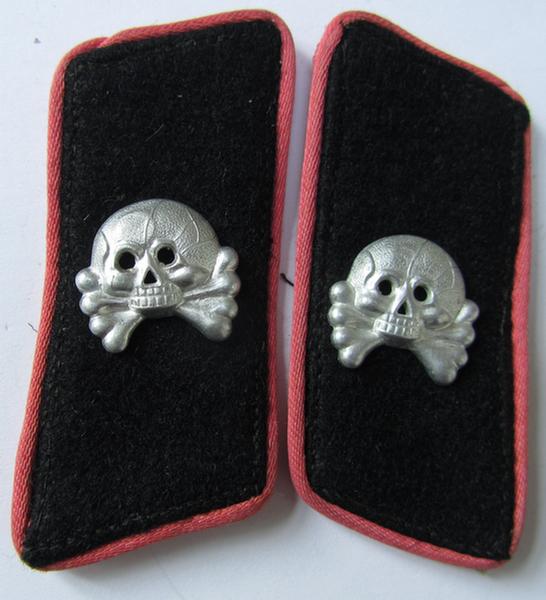 This is truly very nice - and nowadays rarely encountered! - pair of fully matching WH (Heeres) black woolen-based and/or pink- (ie. 'Rosa'-) piped so-called: 'Panzer' collar-tabs, having (also matching!) metal ie. aluminium-based skulls (ie. 'Totenköpfe') attached, in oveall very nice, albeit moderately used and/or uniform-removed, condition. The set shows the brownish-yellow coloured, so-called: 'buckram'-based backing and has two (identical and/or matching!) skulls or 'Totenköpfe' (which both retain their two original, copper-toned pins as can be seen on the pictures). Both skulls are IMO originally attached and do show some minimal wear and/or age. The set - which has the desiranle 'silk-like'-type, bright pink (ie. 'Rosa'-) coloured piping - is in a minimally used and/or uniform-removed condition (some stitching-holes ie. stitching-remains are still visible on the backs) but could excellently serve to restore any black-coloured 'Panzer'-style 'wrap-around' tunic. The set was recently found as such and originated from a private household: it was never before in a collection. Simply a superb and desirable set that is IMO priced according to its unmistaken desirabilty and/or superb, slightly used condition!