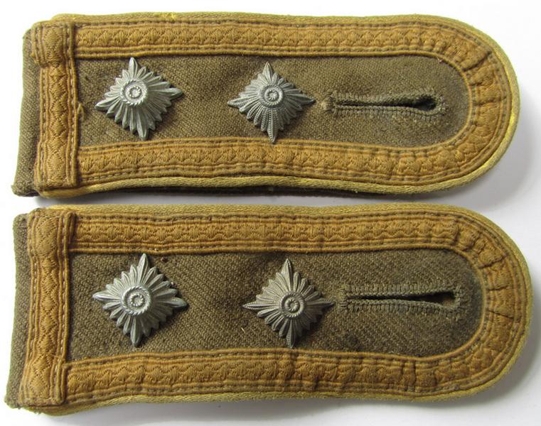 This is a truly very nice - and fully-matching! - pair of (IMO early-war period ie. 'DAK'- or: 'Deutsches Afrika Korps'- related-) WH (Heer) NCO-type, 'tropical' shoulderstraps, piped in the light-yellow- (ie. 'Zitronengelber')- coloured branchcolour, as intended for - and most certainly worn by - an: 'Oberfeldwebel eines Nachrichten-Regiments' (or sergeant first-class within a signals unit ie. regiment), in overall very nice, albeit moderately used ie. worn, condition. The boards - which each measure approximately 11,4 cms. in length - both have the typical brownish-green- (ie. tropical-) coloured and/or linnen-based, 'upperdecks' (and field-grey coloured woolen 'backings' as to be expected) and have the neat and desirable light-yellow coloured (ie. 'Zitronengelber'-) 'silk-like'-type piping. The set comes on its functional tongues and comes as most certainly worn and/or stored for decades. The set has the neat 'tropical'-type, mustard-yellow coloured- (ie. sub-dued-) type NCO-braid attached. Moreover does the set have four (identical and/or zinc-based-) pips attached, denoting the a.m. rank of: 'Feldwebel' (or sergeant first-class). The pair - which is as stated fully matching and was always together and worn as such - is a tiny bit dirty ie. stained and shows the clear evidence of having been moderately used and/or worn. Simply a very nice - and very desirable! - fully 'text-book' NCO-type, tropical shoulderboard-pair that belonged to a: 'Feldwebel eines Nachrichten-Regiments'. It should be noted that all (genuine!) tropical- ie. 'DAK'-related- shoulderstraps are very hard to encounter and can easily be graded 'very rare': this is only the fifth such tropical pair I have ever encountered: the only reason why I sell these is that I have already a similar pair in my private collection. I am aware of the fact that they are highly priced something that is IMO according to their unmistaken rarity and/or desirability!