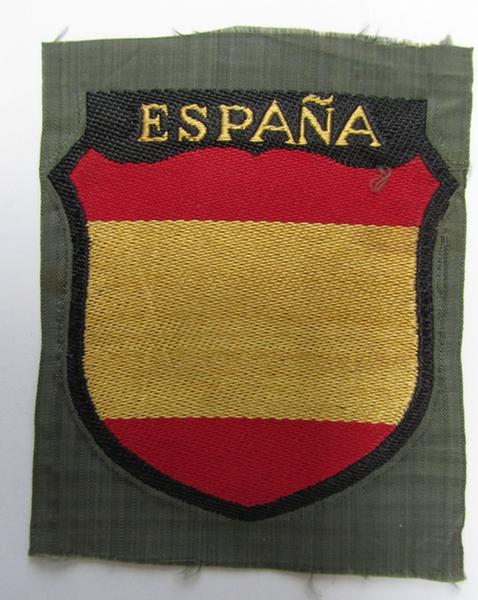 This is a extremely nice - and actually very rarely encountered! - 'BeVo'-type armshield entitled: 'Espana' (= Spain), as intended for a Spanish volunteer within the 'Blue Division' (ie. 'Division Azul'), in overall very nice- ie. mint-/unissued condition. The shield is in absolute unissued and unfolded condition and simply cannot be upgraded: it was never confectioned and just shows some minimal age ie. staining caused by decades of storage only. These - original - 'official' German-made Spanish 'Blue Division' arm-shields executed in 'BeVo'-type weave (ie. of German manufacture by the company of 'BeVo') are considered extremely rare (and are nowadays hardly offered for sale!) something that IMO merits its asking price). Simply a very nice and rare piece of German made cloth-insignia: only the third such rare 'BeVo'-woven piece I ever had on offer!