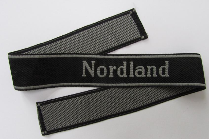 This is a truly very nice - and naturally 100% original! - 1943/44 pattern, Waffen-SS enlisted-mens-type cuff-title depicting the machine-woven Latin script in silver-grey linnen, as intended for a member within the: 11. SS-Frw.-Panzer-Gren.Division 'Nordland', in overall very nice ie. stonemint-/unissued condition. The truly full-length cuff-title (approx. 48/49 cms.) has the typical 'salt and pepper' reverse and shows all details of an original, period-produced specimen. This band was produced by the 'Bandfabrik Ewald Vorsteher' (aka 'BeVo') based in the town of Wuppertal and shows the interwoven company name on one of the ends (something that is not always the case!). This cuff-title is naturally a 100% text-book - and as stated above - original example that originates from a US-veteran who 'liberated' this piece in 1945. The piece shows some really minimal staining and age and was never worn nor tunic-attached. Simply a great opportunity to acquire a nice and actually rarely encountered Waffen-SS 'BeVo'-type cuff-title for a competitive price!