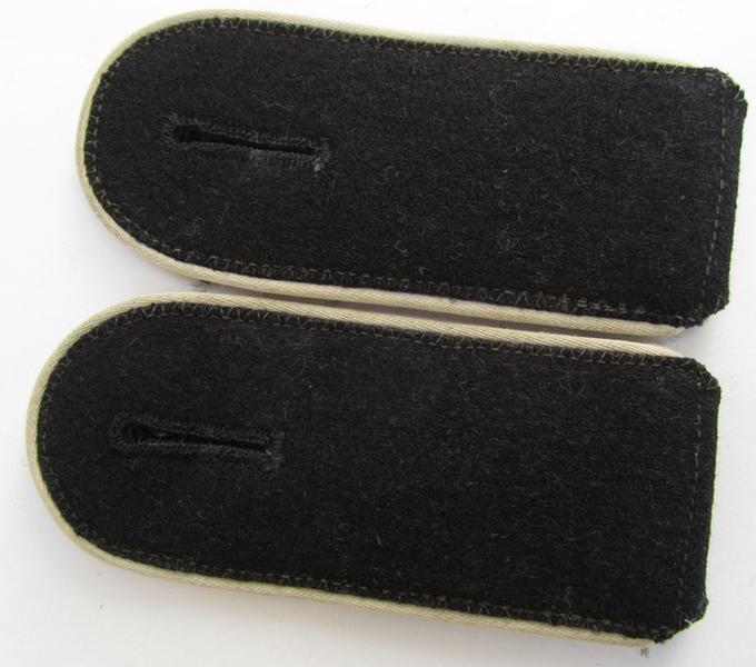 This is a truly very nice - and fully matching! - pair of IMO mid- (ie. later-war-) period-, Waffen-SS, white-piped, enlisted-mens'-type shoulderstraps, as intended for a: 'SS-Schütze der Infanterie' (or simple infantry soldier), in an overall very nice and/or only minimally used ie. worn, condition. The boards - which measure approximately 11 cms. in length as more often and which have a (typical- ie. standard-type-) field-grey coloured 'underlay' (as more often encountered with genuine Waffen-SS-type shoulderboards) are piped in the desirable white- (ie. 'Weisser'-) coloured branchcolour (having the neat silk-like-type piping!) - and were as such intended for an: 'SS-Schütze' within a Waffen-SS 'Infanterie' unit. The straps have the typical SS-type and/or 'smaller-modelled' (and IMO also mid-war-type) tongues attached and show as stated some obvious wear and/or aging: they are a tiny bit dirty ie. stained (as can be seen from the photos). It should be noted that these white-piped SS soldiers'-type boards are very desirable and can easily be graded 'very scarce'. Simply a great and 100% original SS soldiers'-type shoulderboard-set in a very nice albeit minimally worn and/or issued condition: only the third such very collectable Waffen-SS shoulderboard pair I ever had on offer!