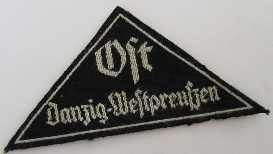 This is a truly superb - and very rarely encountered! - example of a HJ/BDM (ie. 'Hitlerjugend'/'Bund Deutscher Mädel') district-triangle entitled: 'Ost Danzig-Westpreussen', in overall very nice, albeit moderately used and/or clearly shirt-removed, condition. The triangle - which is of course a 'female' specimen, woven in white-coloured linnen on a black-coloured- and also linen-based- background - has regrettably lost its paper-based 'RzM'-etiket but shows some of its remains as is more often encountered (most certainly caused by regular wear). The triangle shows some minimal staining simply caused by decades of storage and/or fair wear. It also shows some of the stitching-remains (ie. holes-) with which it was once tunic-attached. Simply a very nice example of a truly very rarely encountered 'female' BDM-triangle: only the first such very rare piece I ever had on offer!