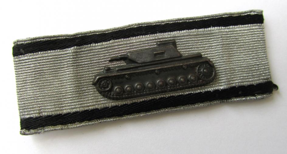 This is a truly stunning - and scarcely encountered! - silver tank-destruction badge (ie. TDB) or: 'Sonderabzeichen für das Niederkämpfen von Panzerkampfwagen usw. durch Einzelkämpfer in Silber', in overall very nice (and IMO only minimally worn ie. tunic-removed-) condition. The piece on offer here is an attractive - and truly very detailed! - example, showing a blackened, silvered (and/or magnetic!) tank-badge mounted on its original piece of 'woven', silver-/black woven cloth. The piece still retains its original prongs and/or metal back-plate (hidden under a piece of darker-blue coloured, smooth-woolen- (ie. felt-) based cloth (as more often) and was most certainly (carefully!) tunic-removed: it still shows some minimal stitching-remains of once having been tunic-attached. The piece came from a private household in Germany and was stored as such for decades. I am of course aware of the fact that this is (probably) one of the most copied awards of the TR-period: this is naturally a 100% genuine example for which I do give a life-time garuantee (as always). I deem that I have priced this neat award accordingly to its desirability and/or unmistaken rarity!