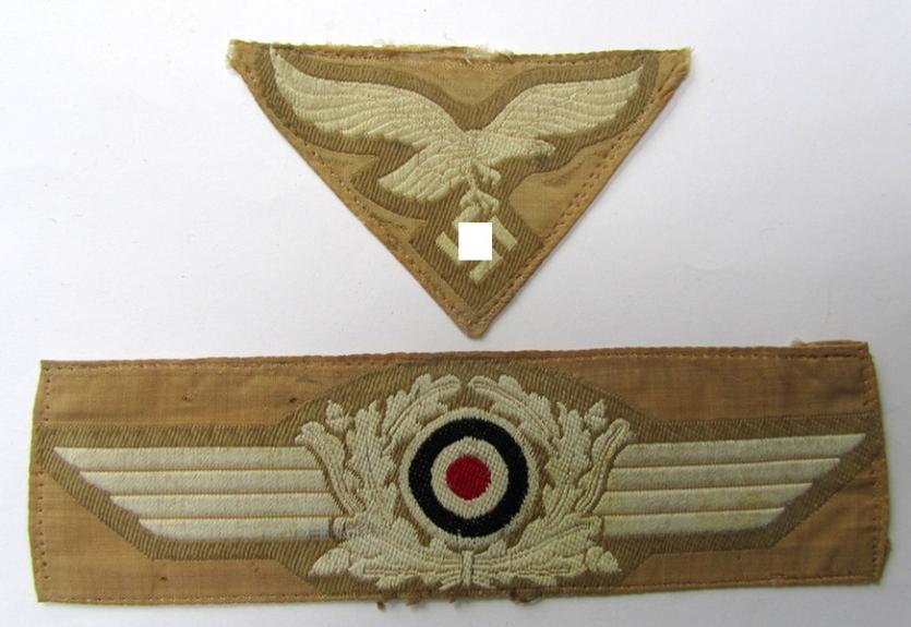 This is possibly one of the most rarest 'BeVo'-woven insignia-sets to encounter: a truly superb and/or fully matching WH (Luftwaffe) tropical cap-eagle- and/or cocarde set as intended for usage on the so-called: 'Hermann Meyer' cap, both pieces in overall very nice, albeit clearly used and/or cap-removed, condition. Both pieces have been clearly worn and were neatly cap-removed. This is only the second such very rare insignia-set I ever had on offer: I deem the high asking-price accordingly for this extremely rare set. Caps without insginia are sometimes offered for sale: the specific inisignia are as far as I know never offered for sale. Simply a very rare and desirable set!