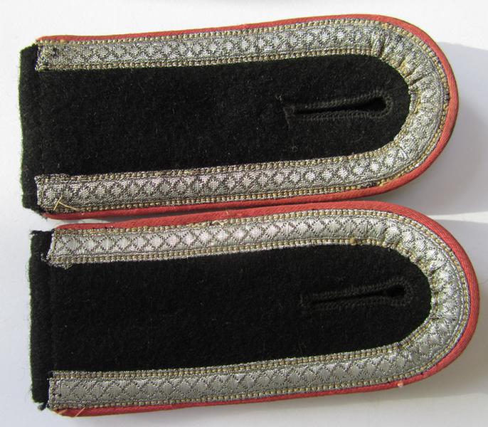 This is a truly very nice - and fully matching! - pair of rarely encountered IMO early-war period-, Waffen-SS, NCO-type shoulderstraps piped in the neat bright-pink (ie. 'Rosa') coloured branchcolour, as intended for - and worn by! - a: 'SS-Unterscharführer der Panzertruppen' (or junior NCO with the SS panzer-troops), in an overall very nice, IMO only minimally used and/or worn, condition. The boards - which measure approximately 10,5 cms. in length and which have a (typical SS-style-) field-grey coloured 'underlay' (as more often encountered with SS shoulderboards) are piped in the desirable bright-pink-coloured branchcolour (having the neat 'silk-like'-type piping!) - and were as such intended for an: 'SS-Unterscharführer' within a Waffen-SS 'Panzer'-unit. The straps have the 'regular-modelled' (and thus IMO early-war-type-) tongues attached and show as stated some moderate wear and/or aging (as can be seen from the photos). It should be noted that these pink-piped SS NCO-type boards are very desirable and can easily be graded 'very scarce'. They can easily be (re-)mounted on a standard (field-grey) tunic of can also be used to complete a black-coloured SS 'wrap-around'-tunic. Simply a stunning and 100% original SS NCO-type shoulderboard-set in a very nice condition: only the first such very collectable pair in this neat branchcolour I ever had on offer!