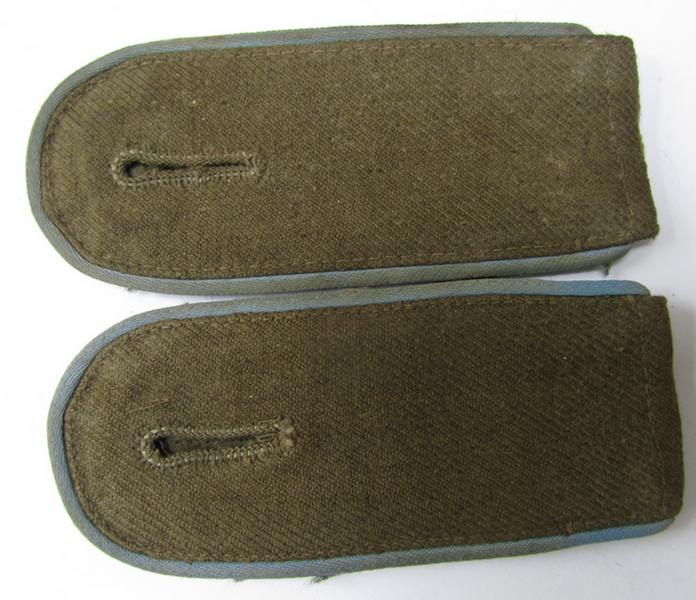 This is a truly very nice - and fully matching! - pair of (IMO fairly early-war period ie. 'DAK'- or: 'Deutsches Afrika Korps'- related-) WH (Heeres) enlisted-mens'-type, 'tropical'-style shoulderstraps, piped in the lighter-blue (ie. 'Hellblauer')- coloured branchcolour, as intended for - and most certainly worn by a: 'Soldat der Nachshub-Truppen' (or transport-soldier), in overall very nice, albeit moderately used ie. worn, condition. The boards - which each measure approximately 10,9 cms. in length - both have the typical brownish-green- (ie. tropical-) coloured and/or linnen-based, 'upperdecks' (and field-grey coloured woolen 'backings' as to be expected) and have the neat and desirable lighter-blue (ie. 'Hellblauer'-) coloured 'silk-like'-type piping. The set comes on its functional tongues and comes as most certainly worn and/or stored for decades. The pair - which is as stated fully matching and was always together and worn as such - is a tiny bit dirty ie. stained and shows the clear evidence of having been moderately used and/or worn. Simply a very nice - and very desirable! - fully 'text-book' enlisted-mens'-type, tropical shoulderboard-pair that belonged to a: 'Soldat der Nachshub-Truppen'. It should be noted that all (genuine!) tropical- ie. 'DAK'-related- shoulderstraps are very hard to encounter and can easily be graded 'very rare': this is only the first such tropical enlisted-mens'-type pair I have ever encountered: the only reason why I sell these is that I have already a similar pair in my private shoulderboard-collection. I am aware of the fact that they are highly priced something that is IMO according to their unmistaken rarity and/or desirability!