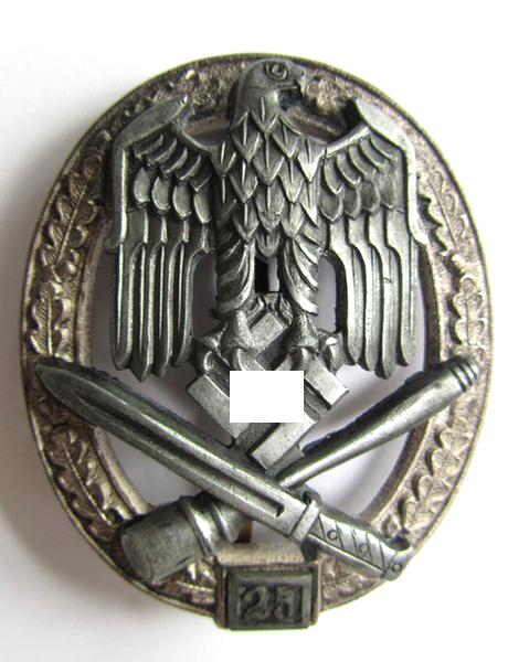 This is a truly attractive - and very rarely encountered, albeit moderately used ie. worn - example of an: 'Allgemeines Sturmabzeichen mit Einsatzzahl 25' (or numbered General Assault Badge ie. GAB, as awarded for participation in 25 combat-actions ie. 'Sturmtage'), being a neatly maker- (ie. 'RK' - or 'Rudolf Karneth'-) marked specimen, as executed in, zinc-based- (ie. 'Feinzink'-) based metal, in overall very nice, albeit IMO moderately used and/or worn, condition. The award retains a fair bit of its quite shiny (ie. somwhat 'frosted'-) silver-coloured finish, but was IMO truly used ie. worn: it has maintained a nice age-patina and comes naturally on its functional (flute-shaped-) pin (which is mounted on a typical crimped mounting as is always the case with badges by this maker). The piece is very detailed and pronounced and has a clear silverish (and as stated neatly 'frosted'!) appearance: the award has IMO been moderately used and shows some wear on the obvious higher areas: it is moreover quite dirty but was IMO never cleaned. The piece is IMO never polished and does still show great pronounced detail. By all means a typical piece without showing any defaults that was produced by - and can be attributed to - the: 'Rudolf A. Karneth u. Söhne' company based in the town of Gablonz. Of course comes this piece with a life-time garuantee on its originality (as always). Simply a stunning and very rare piece that is priced according to its rarity and/or desirability: only the first such high-class award I ever had on offer!