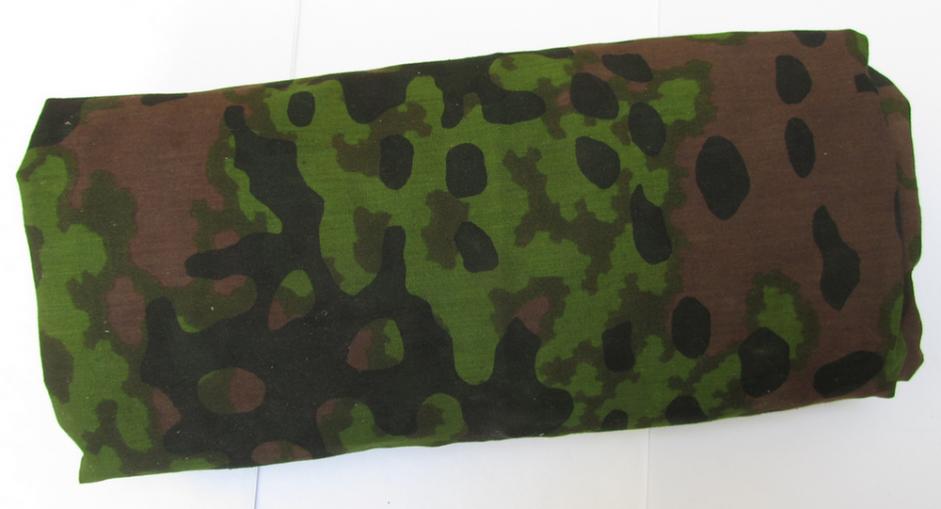 This is a truly very nice - and actually rarely encountered! - Waffen-SS, M31-model shelter-quarter/poncho (ie. 'Zeltbahn'), being of the desirable, so-called: plane-tree #2 (ie. 'Platane') overprint pattern, which is very nice maker-stamped and/or dated: '1943', in overall very nice (ie. virtually mint-/unissued!) condition. The 'M31 Zeltbahn' was a standard issue item and came accompanied with various tenting accessories (such as rope, poles and/or tent-pegs) enabling the soldier to utilize his quarter-shelter with three others to form a small tent. These equipment-pieces were carried mounted on the - also standard issued - 'A-Rahmen' (or: A-frames). The plane-tree camouflage pattern was originally developed in 1936 and was utilized by the members of the 'SS-Verfügungstruppen' until a new 'plane tree'-pattern was developed in 1940. The new 1940 'plane three camouflage pattern' was produced in six different models that were all utilized throughout the war by the various Waffen-SS troops. The piece on offer here originates from my personal collection and is truly in a wonderfull condition overall: all (zinc-based) rings and/or most buttons are present and in place whereas the piece itself (constructed of water-resistant linnen duck-) is totally void of any real damage: the piece retains wonderfull bright- and/or vivid colours and simply cannot be upgraded. It bears a clear imprinted 2 numeral as can be seen on the photos and shows furthermore two (fairly large-sized!) ink-stamps, showing both the maker and/or date: '1943'. Simply a superb and very desirable Waffen-SS equipment-item: only the second such neat item I ever had on offer!