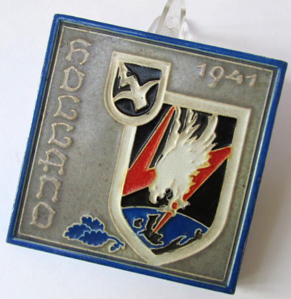 This is a very attractive - and unusually encountered! - example of a Dutch-made, WH (Luftwaffe) colourful and/or earthenware-based souvenir-tile (sized: 10,5 x 10,5 cms.) depicting the (semi-official) badge from the famous: 'Nachtjagdgeschwader 1', next to the depicted title: 'Holland' and the year of issue: '1941', in overall very nice and/or fully undamaged condition. The neat and truly very decorative tile - which is 100% period-made and which originates from the (famous) Dutch earthenware producing company named: 'Westraven' based in Utrecht - was distributed by a company called: 'Blankenvoort' in Zeist and is nicely hand-coloured and still retains a fairly 'glossy' appearance. The title is void of any damage and shows two (factory applied-) holes on the back (present in order to hang it on a wall). These 'souvenir-titles' were solely produced for the German-troops based in Holland and were quite popular amongst the members of this famous 'Nachtjagdgeschwader' who were at that time (ie. in 1941) in occupied Holland. Simply a very attractive and surely unsually encountered artifact from a famous LW 'nightfigthing unit', the 'Nachtjagdgeschwader 1', which unit was active in Northern Europe (Holland). Only the second such very attractive item I ever had on offer!