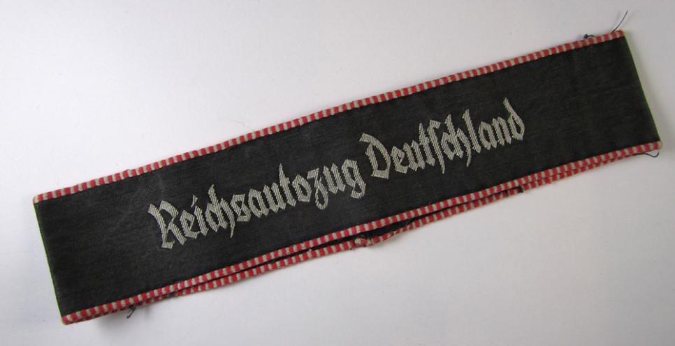 This is a truly very nice - and extremely rarely encountered! - specimen of the greyish-coloured (and/or white/red-piped-) armband ie. cuff-title as executed in 'BeVo-weave' pattern, as intended for - and worn by! - the members within the 'N.S.D.A.P. Reichsautozug Deutschland' (or: 'RaZ'), in overall very nice (albeit moderately used ie. worn-) condition. This organisation - named the 'N.S.D.A.P. Reichsautozug' (or: 'RaZ') - was likely the smallest party-related formation within the Third Reich of which not much is known to date. Although it was a formation that was infact more related to the SA ('Sturmabteilungen'), it was attached to the N.S.D.A.P. head-quarters based in Münich. It most likely never numbered more than 200 members. This organisation was in charge of furnishing and setting-up all that was necessary to handle a large-scale party rally. Their responsibilities included setting-up and maintaining audio systems, seating, shelter and housing, field kitchens and/or latrines. The cuff-title on offer here is in a moderately used and most certainly worn condition: is shows some minimal age and/or staining and shows one (period!) repaired hole (see picture). The piece measures 42 x 4,5 cms. and is still sewn-together as worn. It originates from a private household and was never before part of a collection. The piece is - as stated above - executed in neat 'BeVo-weave' pattern and shows extraordinary detail. I am pretty convinced that not many of these rare armbands have survived and this is actually the first such rare piece I did ever have encounter. Simply a very nice and most certainly very rare N.S.D.A.P.-related armband ie. cuff-title!
