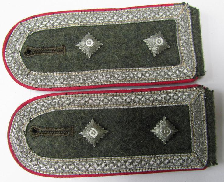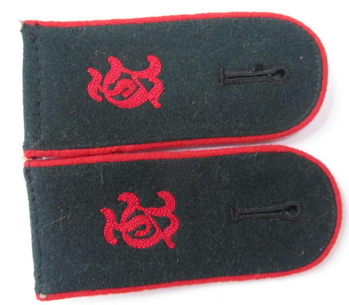 This is a truly awesome - and very rarely encountered! - fully matching pair of IMO mid-war period WH (Heer) NCO-type shoulderstraps, as intended for an: 'Oberfeldwebel der Veterinäre (NCO ie. sergeant first-class in a veterinarian unit), in overall very nice condition. The boards - which each measure approximately 12 cms. in length - both have field-grey coloured and woolen-based, upperdecks and have the neat, reddish-pink (ie. 'Karmesin-Rot') coloured, 'silk-like'-type piping. The set comes on its functional tongues and comes as stored for decades. The set has the standard-type, silver-coloured NCO-braid attached and also shows four (identical) fairly small-sized zinc-based pips attached (denoting the rank of 'Oberfeldwebel'). As possibly known is this typical 'Karmesin-Rotes'-branchcolour very rare and can IMO be regarded as one of the most rarely encountered branchcolours of the Deutsche Wehrmacht! Simply a very nice and desirable NCO-type shoulderboard-pair that was never before in a collection. This is only the first such very rare pair I have ever encountered and I deem the my asking-price is accordingly to the rarity. Maybe a unique opportunity to acquire such a very rare pair of Veterinarian shoulderboards!