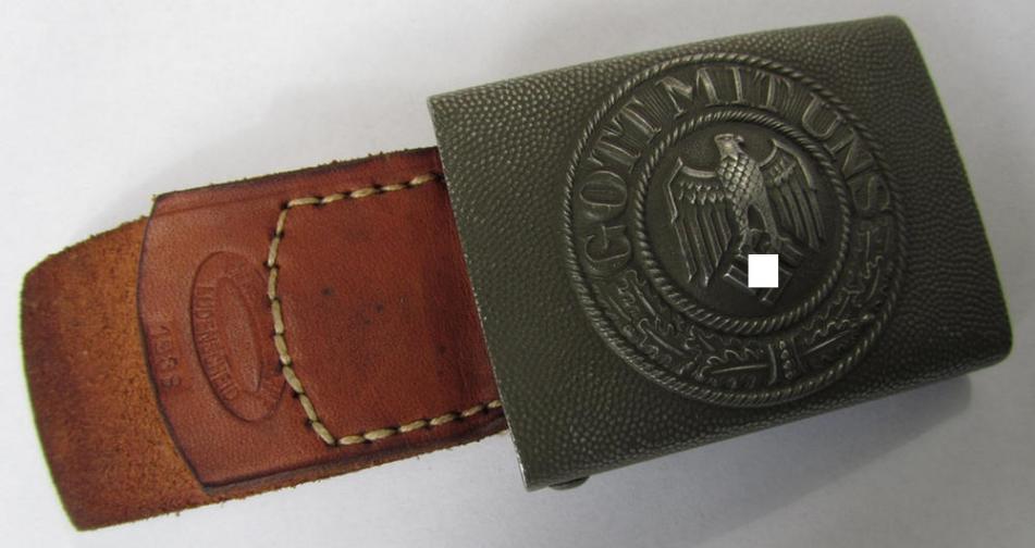 This is an overall very nice - and IMO only minimal used ie. worn! - example of a rarely encountered WH (Heer) field-grey-coloured and '1939'-dated, aluminium-based belt-buckle that comes mounted on its original, natural coloured leather tab, as produced by the maker named: 'Assmann u. Söhne', based in Lüdenscheid, in overall very nice (ie. IMO minimal used and/or worn!) condition. The buckle was most certainly issued and/or worn but still retains most of its original field-grey painted colour (which is rarely seen!): just some normal scratching and paint-loss is visible on the higher areas as more often encountered. The piece is still a bit dirty ie. dusty but was most certainly never cleaned nor polished and comes as found. The buckle itself is however not marked: just the tab bears the makers-signification. The neat leather tab is still fully functional and completely souple (and never oiled nor greased). The oval-shaped 'Assmann u. Söhne' dry-stamp (visible on the tab) is readable and of course present. The leather tab is fully functional and is souple and nice. The rounded ie. oval-shaped 'Assmann u. Söhne stamp (visible on the tab) is in itself void of a date: something that is more often encountered on buckles by this maker: the date: '1939' is seperately 'dry-stamped' directly under the oval stamp as is more often encountered. It should be noted that these very nice and desirable WH (Heeres) buckles are nowadays hard to encounter: especially the aluminium-ones still bearing their original colour, something that merits its high asking price. Simply a very nice Heeres buckle by the 'Assmann u. Söhne' company!