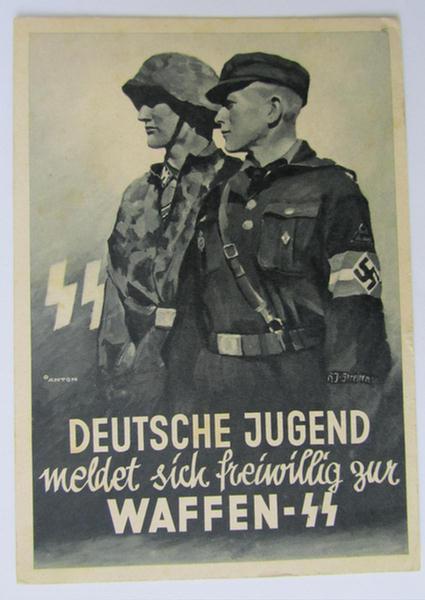 This is a very nice (and truly rarely encountered!) period Waffen-SS-related postcard, depicting the well-known illustration of a Waffen-SS soldier & HJ-member with below the text: Deutsche Jugend meldet sich freiwillig zur Waffen-SS by the war-artist Anton, in very nice (ie. isssued-/sent) condition. The card is in a very nice albeit issued condition: it was sent as a Feldpost-card in June 1942 and shows writing ie. text. The card - which is totally undamaged - is sized: 15 x 11 cms. and shows the text: Herausgegeben vom SS-Hauptamt - Ergänzungsamt der Waffen-SS. The card was sent by a soldier (from the front) who apparently served within a unit that had the Feldpost-number: 29201 (it is neatly and clearly green-ink-stamped as such). Simply a very rare Waffen-SS related post-card that is not often offered for sale: I have seen these being sold for much more at specialised post-card auctions. The first such rare card I ever had on offer!