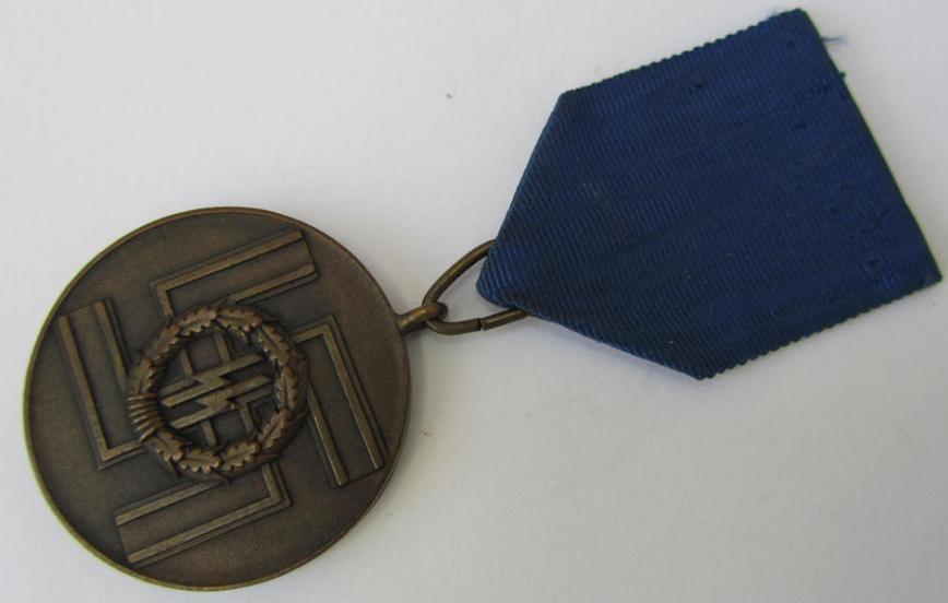 This is a truly rarely encountered example of a stunning 'SS-Dienstauszeichnung 3. Stufe - Medaille für 8 Dienstjahre' (= loyal service medal for 8 years of loyal service) that is executed in bronze-coloured 'Buntmetall' and that comes mounted on its original (cornflower-blue coloured) ribbon as issued and recently found, in very nice, and IMO only slightly worn ie. used condition. The piece - which is very nicely detailed as usual! - comes on its typical 'drop-shaped' ring (aka 'Tropfenöse') and has never been cleaned nor polished: the piece retains a neat fairly 'darkened' bronze-coloured finish. The piece comes as stated above on its originally mounted (approximately 10 cms. sized) cornflower-blue coloured ribbon as issued and most likely worn. The piece was recently found at a private household and was never before in a collection. I have priced this very attractive piece according to its rarrity and truly stunning condition!