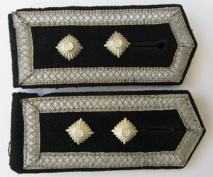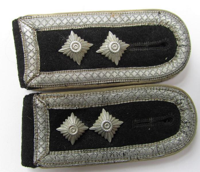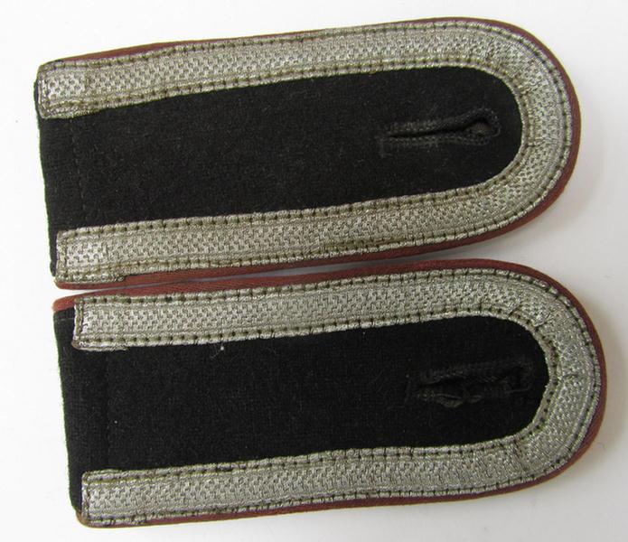 This is a stunning - and fully matching! - pair of WH (Heer), IMO mid-war period, NCO-type shoulderboards as worn on the black 'wrap-around' tunics, as intended for an: 'Unteroffizier der Panzer-Truppen', in overall very nice, albeit minimal used ie. worn condition. The boards - which naturally have the black coloured and woolen-based upper-decks - have the specific bright-pink ('silk-like'-type) piping and measure each approximately 10,3 cms. in length. They come on their original tongues and are in a very nice, ie. fully 'text-book' condition overall. They show as stated above only minimal usage (some age, dust and staining is visible). Both boards show the neat 'standard' (ie. early WH-type, silverish-grey and fairly shiny NCO-braid attached. Simply a superb and matching pair of moderately used black-coloured 'Panzer-Truppen' boards that can easily serve to complete any mid-war 'Heeres' black 'wrap-around' tunic or even a 'Sturmgeschütze' ie. HBT-based 'wrap-around' jacket. A very nice and desirable pair that came directly from a German flea-market and that was never before in a collection: IMO did I price this pair according to its rarity! Only the first such 'Heeres'-pair I ever had on offer!