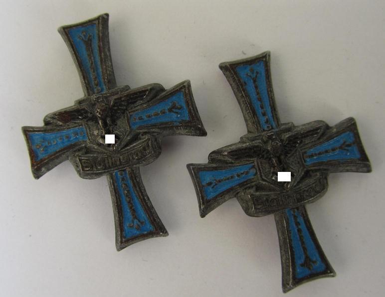 This is a truly nice and very rare - and fully matching! - pair of WH (Heer) so-called: 'Stalingrad' shoulderboard cyphers (or 'Schulterstückauflagen'), as intended for usage by members of the famous 'Hoch- und Deutschmeister' regiment, both in avery nice (IMO mint-/unissued!) condition. These so-called: 'Hoch- und Deutschmeister-Kreuze' (aka 'Stalingrad-Kreuze') were authorized for usage by certain divisions and was institutioned on 23 March 1944. The small-sized emblems take the form of a small 'Maltese cross' depicting a 'Reichsadler' and banner in the center under which the text: 'Stalingrad' can be observed. The emblems were authorized to be worn on the epaulettes of all ranks, including those of replacement troops. It was also used as a semi-official cap insignia. The 'cypher'-set on offer here was IMO never used and both pieces still retain all their four (!) original and still functional prongs (they have never been bent). Both cyphers have lovely detail and finish. Original examples as these are almost never appearing on the market: matching pairs are even more rarely offered for sale. Simply a truly nice and very rare original shoulderboard cypher-pair: great to promote a pair of shoulderboards or to be stored in any (shoulderboard) collection. Only the first such very rare item I ever had on offer!