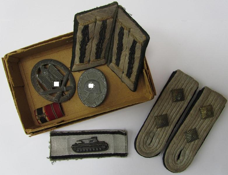 This is a really superb 8-pieced insignia and or award-grouping (including a neat and rarely encountered, silver-class 'Sonderabzeichen für das Niederkämpfen von Panzerkampfwagen usw. durch Einzelkämpfer' or tank-destruction badge!) all eight pieces as worn by a (regrettably unidentified) 'Hauptmann der Pioniere' (or engineers captain), all pieces in overall nice, albeit clearly used ie. tunic-removed condition. The grouping comprises of a neat - and fully matching! - pair of WH (Heer) officers'-type collar-tabs and/or shoulderboards, both piped in the black coloured branch-colour, as intended for - and worn by - a 'Hauptmann der Pioniere' (engineers' captain), all four pieces in an overall nice albeit clearly worn ie. used condition. All four pieces - which are constructed from the 'smooth-type' (ie. moleskin-like) wool - are in a used condition overall and clearly show the signs of having been tunic-removed: the somewhat 'dull-grey'-coloured (ie. 'sub-dued') appearance of embroidery on both boards and/or tabs is fully present and preserved. The tabs are 'backed' with yellowish-coloured 'buckram' as more often and show nice embroidery. The set was clearly mounted on a tunic and shows obvious stitching-remains. The boards - which measure 10,5 cms. in length - each show two (identical and regular sized pips) attached: all devices are in a nice condition overall but are all tarnished. The boards come with their (typical small-sized) 'officers'-type tongues attached. Next to this these cloth-insignia the grouping holds both a silver wound badge (or 'Verwundeten Abzeichen in Silber') and a neat general assault badge (or) GAB (ie 'Allgemeines-Sturmabzeichen'): both are unmarked, zinc-based (ie. 'Feinzink') examples that come on their functional pin-/catch set-ups: both were most certainly never cleaned and have a regular (typical zinc-) age-patina. There is also a 2-pieced Band-/Feldspange showing the ribbons for both a 'KvK II. Kl.' and an 'Ost'-medal: this example is also functional but shows some obvious staining ie. wear. Last but not least the grouping contains an awesome silver-class 'Sonderabzeichen für das Niederkämpfen von Panzerkampfwagen usw. durch Einzelkämpfer' (or tank-destruction badge). This is a neat - very detailed! - example, showing a blackened, silvered (and magnetic!) tank-badge mounted on its original piece of silver-/black woven cloth. The piece still retains its (three) original prongs and/or metal back-plate and was most certainly (carefully!) tunic-removed: it still shows the stitching-remains of once having been tunic attached. All pieces came in a small carton box as stored for decades. This neat grouping was recently found at a private household and was never before in a collection: it belonged to the same 'Hauptmann der Pioniere' (or engineers captain), who most certainly wore and stored this insignia-grouping for decades. I deem that I have priced this awesome grouping accordingly to its desirability and rarity!