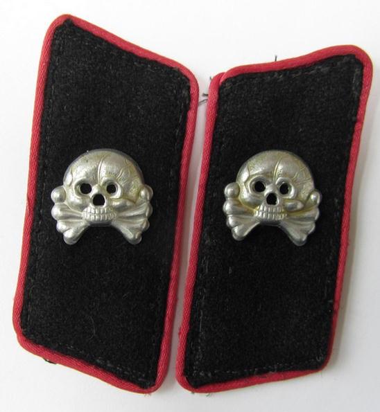 This is a nowadays rarely encountered - and fully matching! - pair of WH (Heer) black woolen based and bright pink-piped 'Panzer' collar-tabs (as used - amongst others - on the black-coloured 'wrap-around' 'Panzer' tunics) having metal-based (ie. aluminium-based) 'Totenköpfe' (ie. skulls) period attached, in overall very nice, albeit clearly used ie. uniform-removed condition. The set has the dark-yellow 'buckram' backing and both skulls (each retaining just one of their original pins) are IMO originally attached to the tabs: both skulls are matching and identical in execution (they are just not completely centered something that was IMO most certainly period-done). The set - which has the desirable, bright pink-coloured 'silk-like'-type piping as to be expected - is as stated in clearly used and/or uniform-removed condition (stitching-holes and thread-remains are still visible and present) and would be excellent fitted to restore a black Panzer tunic ie. wrapper. Simply a very nice and desirable set that is nowadays almost impossible to encounter!
