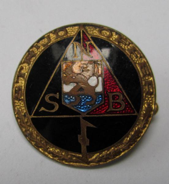 This is a very nice example of the rare Dutch NSB ('Nationaal Socialistische Beweging') 10-years commemorative and/or honorary lapel-pin: 'Strijd en Offer', bearing a unique - and very low! - award-number (701) and engraved: Stamboeknummer (or NSB partynumber), that reads: 46198, in overall very nice albeit worn and issued condition. These very scarce badges were only awarded to men and were instituted in 1943 to commemorate the 10-years existance of the NSB and were - as stated - only bestowed in a very limited number. They were given to party officials that had (for example) concluded service at the Eastern Front or had otherwise contributed to the party. This example is engraved with the unique award number: '701', which number signifies the badge' individual number. The badge shows some slight scratching but has a totally undamaged enamel surface. A nice and truly rare NSB lapel-pin: only the second such badge I ever had on offer!