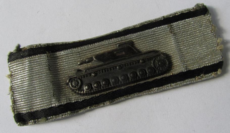 This is a really very nice example of a silver-class so-called: 'Sonderabzeichen für das Niederkämpfen von Panzerkampfwagen usw. durch Einzelkämpfer' (or tank-destruction arm-badge) in overall very nice, albeit clearly used ie. tunic-removed condition. The - very detailed! - example, shows a blackened ie. silvered (and magnetic!) tank-badge mounted on its original - and typical! - piece of silver-/black coloured and/or woven cloth. The piece still retains its (three) original metal prongs and/or metal back-plate and was most certainly (carefully!) tunic-removed: it still shows the stitching-remains of once having been tunic attached. These neat tank-destruction badges are sometimes encountered but most times it deals with mint-/unissued examples: the example on offer here is clearly worn ie. tunic-removed, making it IMO a more desirable award. I deem that I have priced this nice and decorative award according to its desirability and rarity!