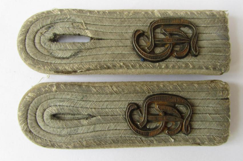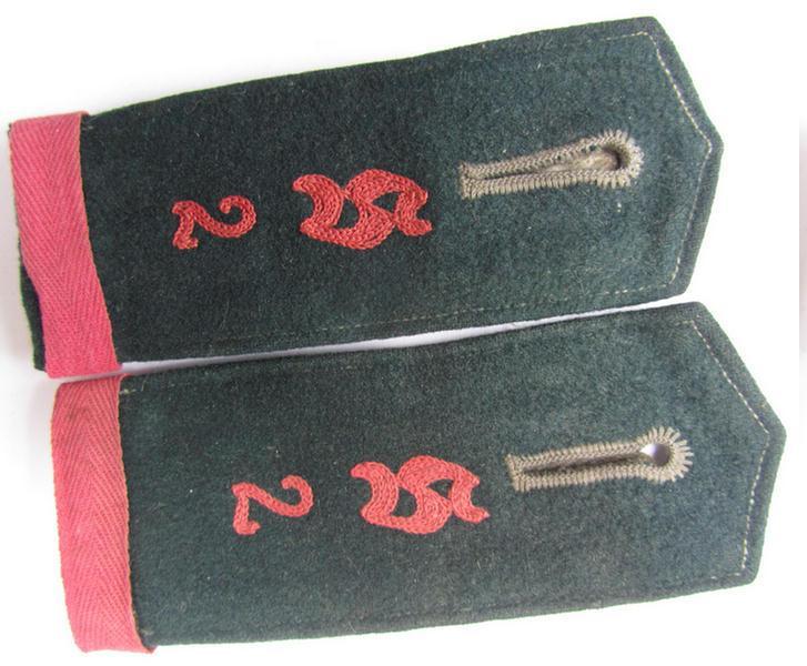 This is a truly very nice - and fully matching and rarely encountered! - pair of of early-/ie. pre-war pattern, WH (Heer) 'M36-type' (pointed model and non-piped) cyphered shoulderboards, as intended for a: 'Soldat des (Panzer)Schützen-Regiments 2', in overall very nice albeit clearly used and/or worn condition. The boards - which are text-book in all facets! - are of the non-piped-type (as always) and show the neat Gothic-style S-cyphers and 2 numerals, executed in bright-pink coloured machine-stitching (or Kurbelstickerei). Moreover does the pair show two (also rarely encountered!) pink-coloured regimental designator-stripes attached: both are executed in linnen and were most certainly always attached to the set. The pair - which has the regular darker-green woolen upperdecks - is clearly void of any real damage but does show staining and/or wear: it is most certainly used ie. worn. The boards come on their functional tongues and measure both approximately 11 cms. in length. Of addirtional interest is the fact that this set was (IMO) worn upside-down (ie. having the cyphered upper-decks invisible): one and other would clarify the (slightly) damaged inner-side of the tongues! Simply an awesome and equally desirable (ie. rare!) pair of IMO early Panzer-related cyphered boards: it should be noted that these nice and early sets are really not often offered for sale: this is just the first such pair I ever had on offer!