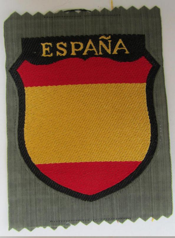 This is a extremely nice (and very rare!) 'BeVo'-type armshield entitled: 'Espana' (= Spain), as intended for a Spanish volunteer in the 'Blue Division' or 'Division Azul', in stonemint/unissued condition. The shield is in absolute mint, unissued condition and simply cannot be upgraded. These - original - 'official' Spanish 'Blue Division' arm-shields executed in 'BeVo'-type weave (ie. German manufacture by the company of 'BeVo'!) are considered extremely rare (and are hardly offered for sale!) something that IMO merits its high asking price). A very nice and rare piece of German-made cloth insignia!