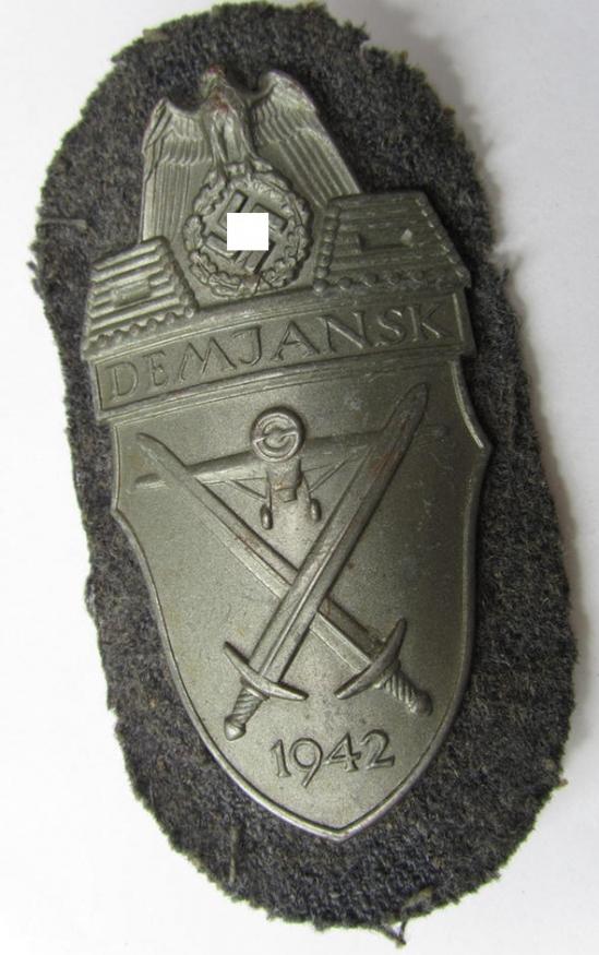 This is a truly very nice and detailed example of the (fairly scarcely encountered!) WH (Luftwaffe) 'Demjansk' campaign shield, in overall very nice, albeit clearly used and/or issued ie. worn condition. The (magnetic) shield - executed in silver-coloured so-called: 'Eisenblech' - comes naturally complete with its metal back-plate and naturally retains its 4 originally attached pins: it is also retains (most of) its beige-coloured backing-paper as is more often encountered. The shield shows some truly normal wear and/or aging (some very minor staining is visible and present) but still retains truly extraordinary detail as to be expected. The shield is a bit dirty (from years of storage ie. wear) and was of course never cleaned nor polished. It was surely once attached to a tunic. The piece originates from a private household and was never before in a collection. It should furthermore be mentioned that 'Demjansk' campaign-shields as specifically intended for Luftwaffe-usage are very hard to come by. Simply nice - and original! - example of this very collectable and desirable campaign-shield that nowadays is not often offered for sale: maybe the nicest such example I ever had on offer!