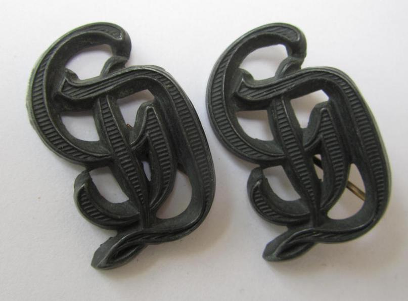 This is a very nice and most certainly very desirable item: a neat and scarcely encountered and fully matching pair of (silver-finished thus NCO-type) so-called: 'GD' (= 'GrossDeutschland') shoulderboard-cyphers, both in overall nice albeit used but still functional condition. Both pieces have IMO never been cleaned nor polished and have a truly darkened age-patina: both pieces are executed in zinc-based metal (ie. 'Feinzink') and are clearly used ie. board-removed. One of the cyphers has still both regular (thin-shaped) prongs in place whereas the other one misses one of its prongs (the set is however IMO still fully functional). Simply a very nice and 100% original 'GrossDeutschland' shoulderboard-cypher set that was never before in a collection: great to restore a pair of NCO-type shoulderboards or to simply store in any collection!